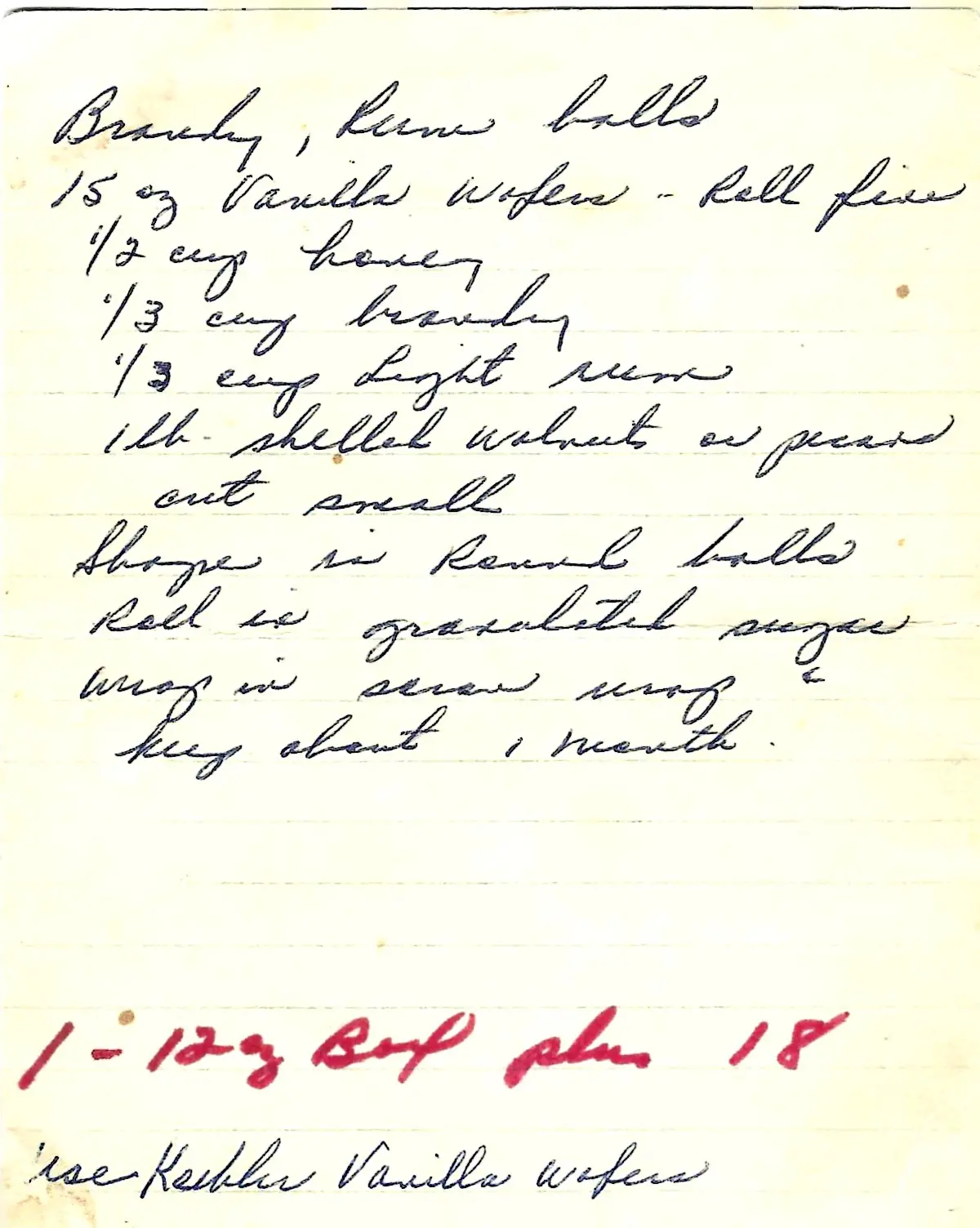 The recipe card specifies to “use Keebler Vanilla Wafers” and notes that the balls will keep for about 1 month. The flavor improves significantly after they have aged for a few days.
