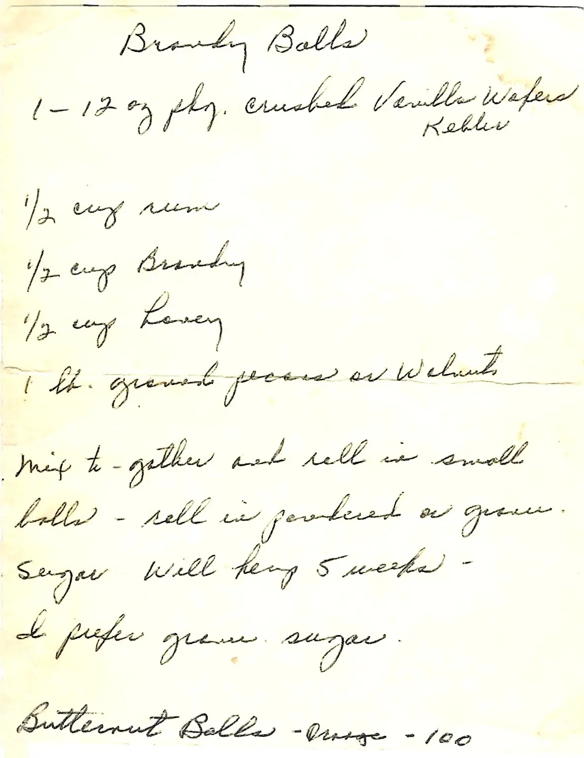 The author notes, “I prefer gran. sugar” and says the balls will keep for 5 weeks. Like other recipes of this type, the flavor improves significantly after they have aged for a few days.