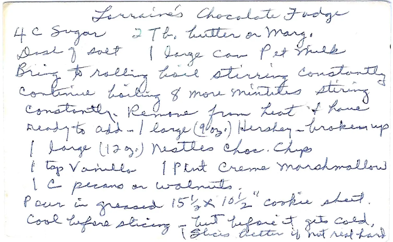 - Let the fudge cool until it is set but still slightly warm, then slice it into squares. (As the card notes, it slices better before it gets completely hard).