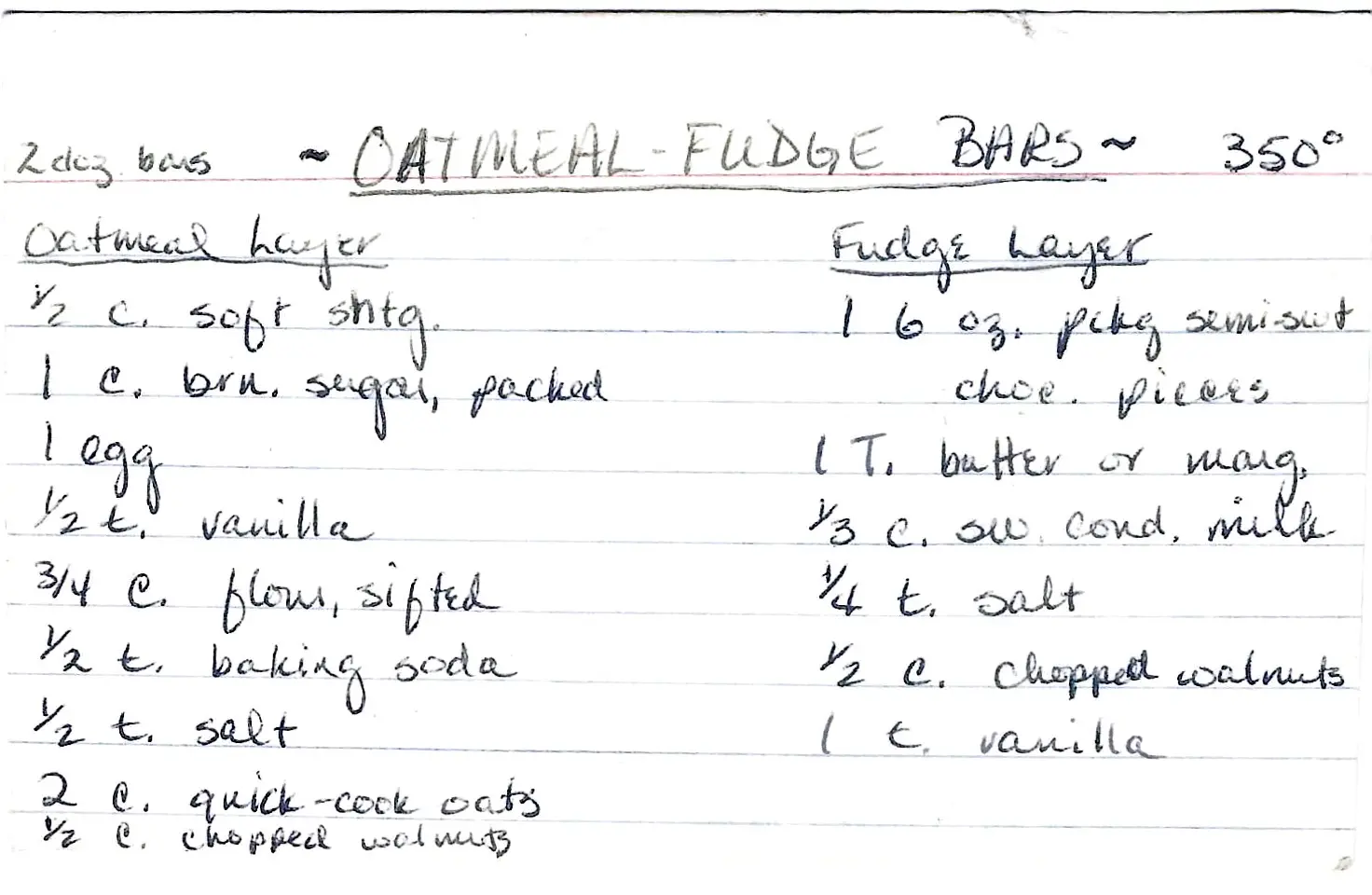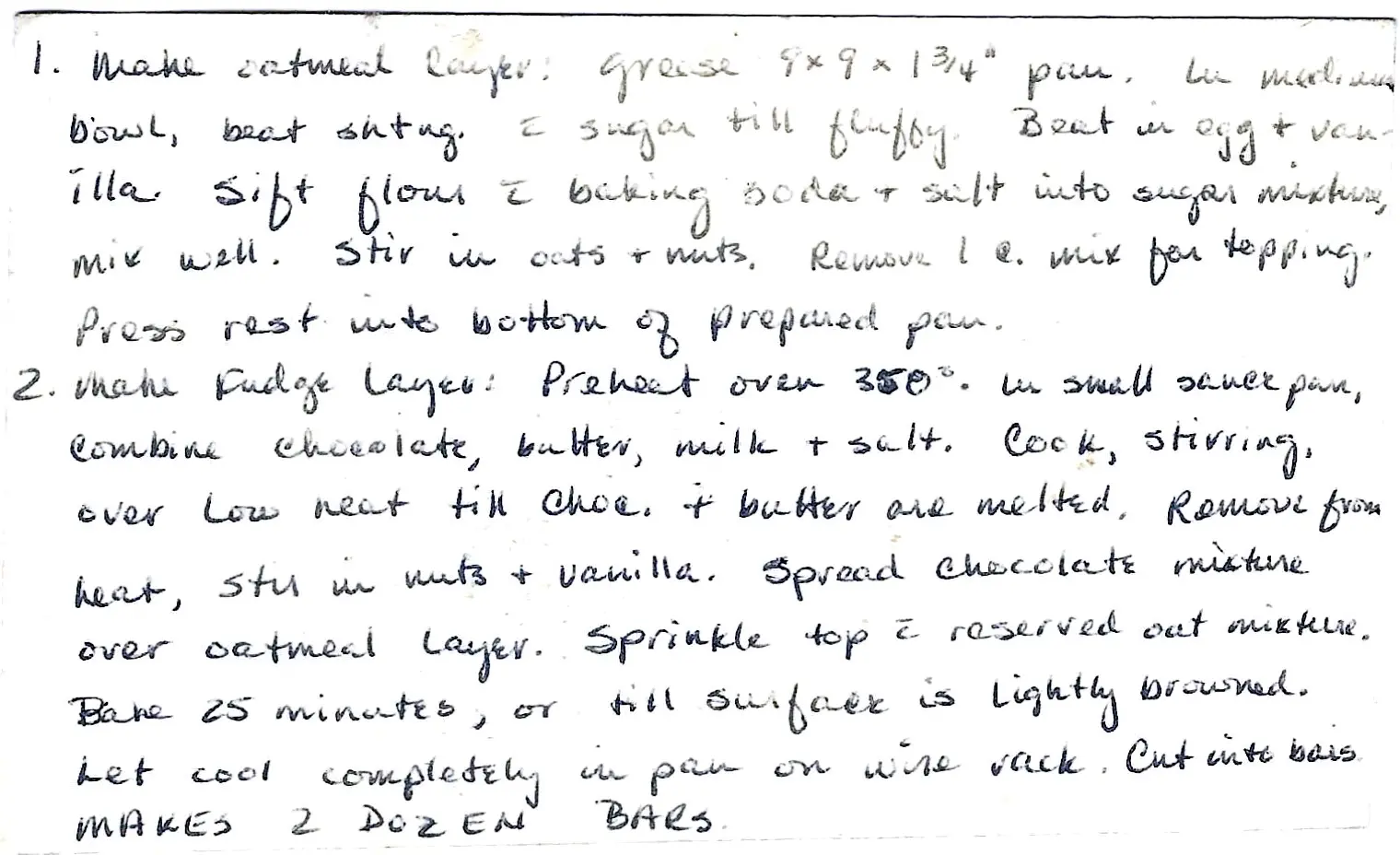 A decadent layered bar cookie featuring a chewy oatmeal-walnut crust and topping, with a rich, gooey fudge filling made from chocolate chips and sweetened condensed milk.