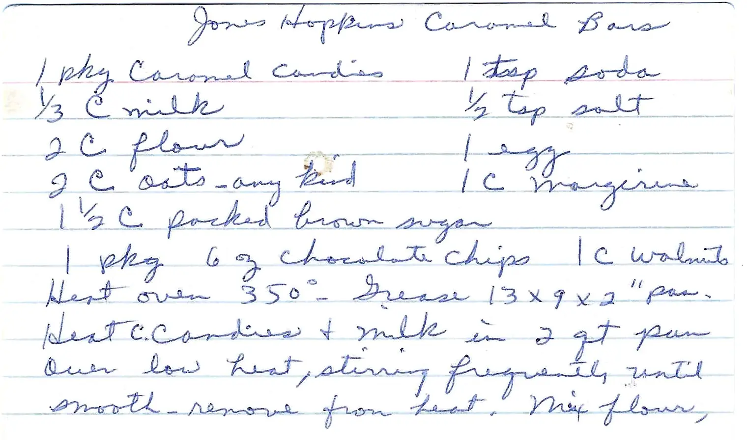 A classic recipe from Jones Hopkins for rich and gooey caramel bars, also known as Carmelitas. A buttery oat crust is layered with melted caramel, chocolate chips, and walnuts, then topped with more of the crumbly oat mixture.