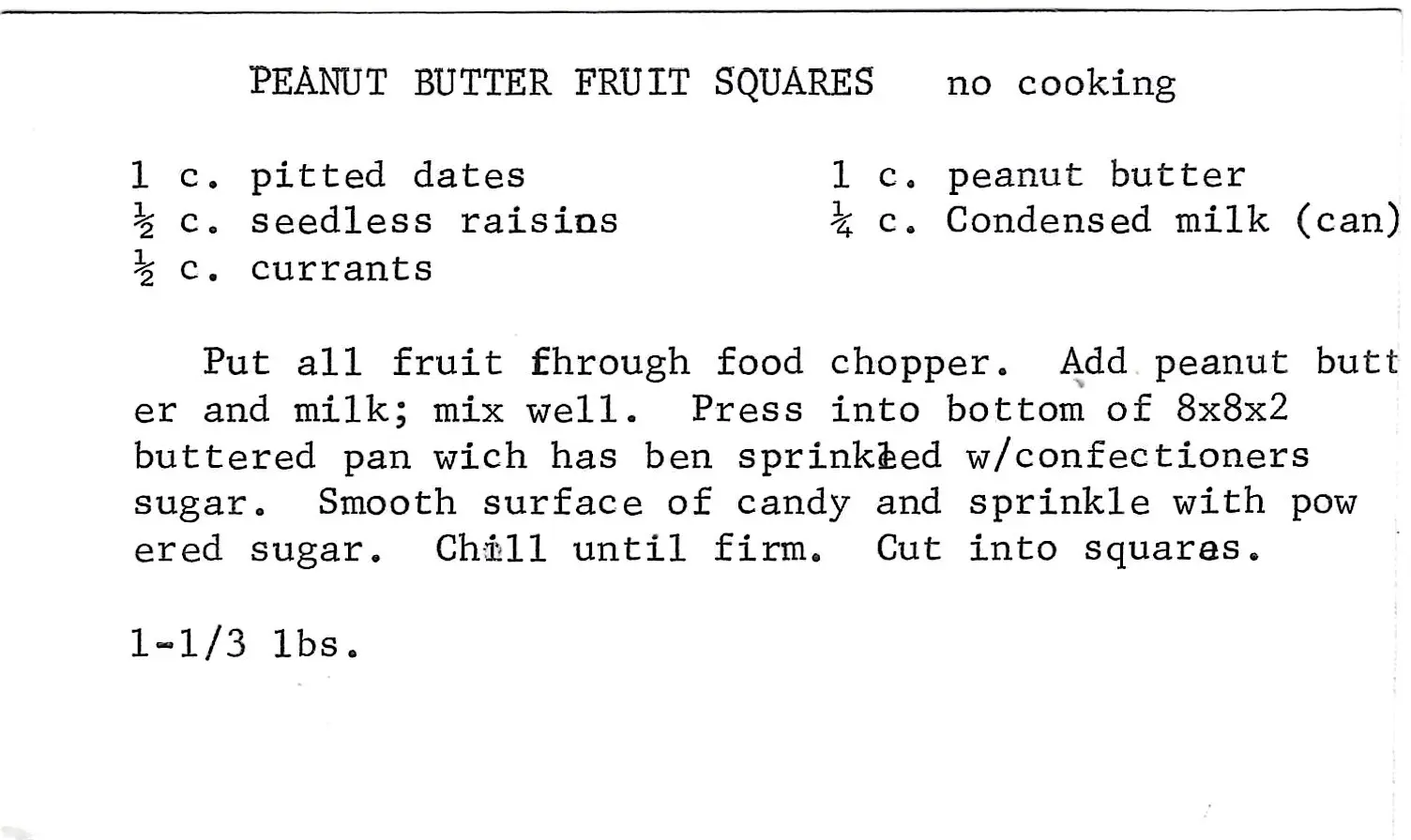 A simple, no-bake recipe for wholesome fruit squares. This easy confection combines ground dates, raisins, and currants with peanut butter and a touch of condensed milk for a rich, chewy treat.