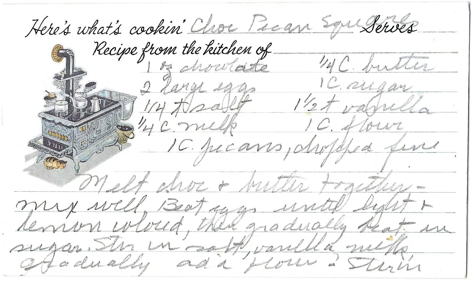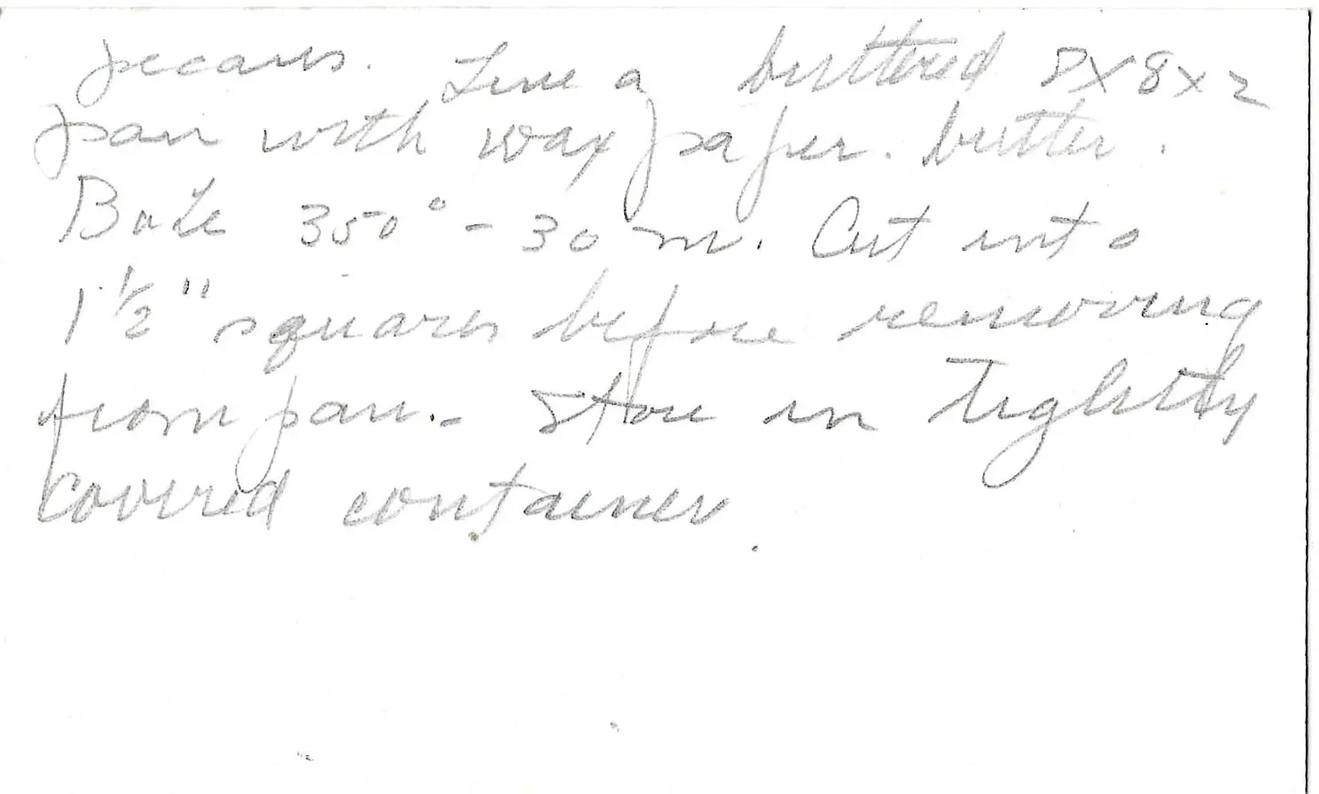 A rich, brownie-like bar cookie loaded with finely chopped pecans. These are baked in a square pan lined with waxed paper and cut into small squares while warm.