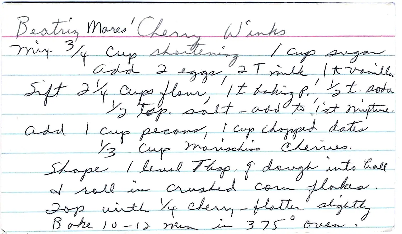 A classic mid-century cookie recipe from Beatriz Mares. These “Cherry Winks” are wonderfully chewy, packed with dates and pecans, rolled in crunchy corn flakes, and topped with a bright maraschino cherry.