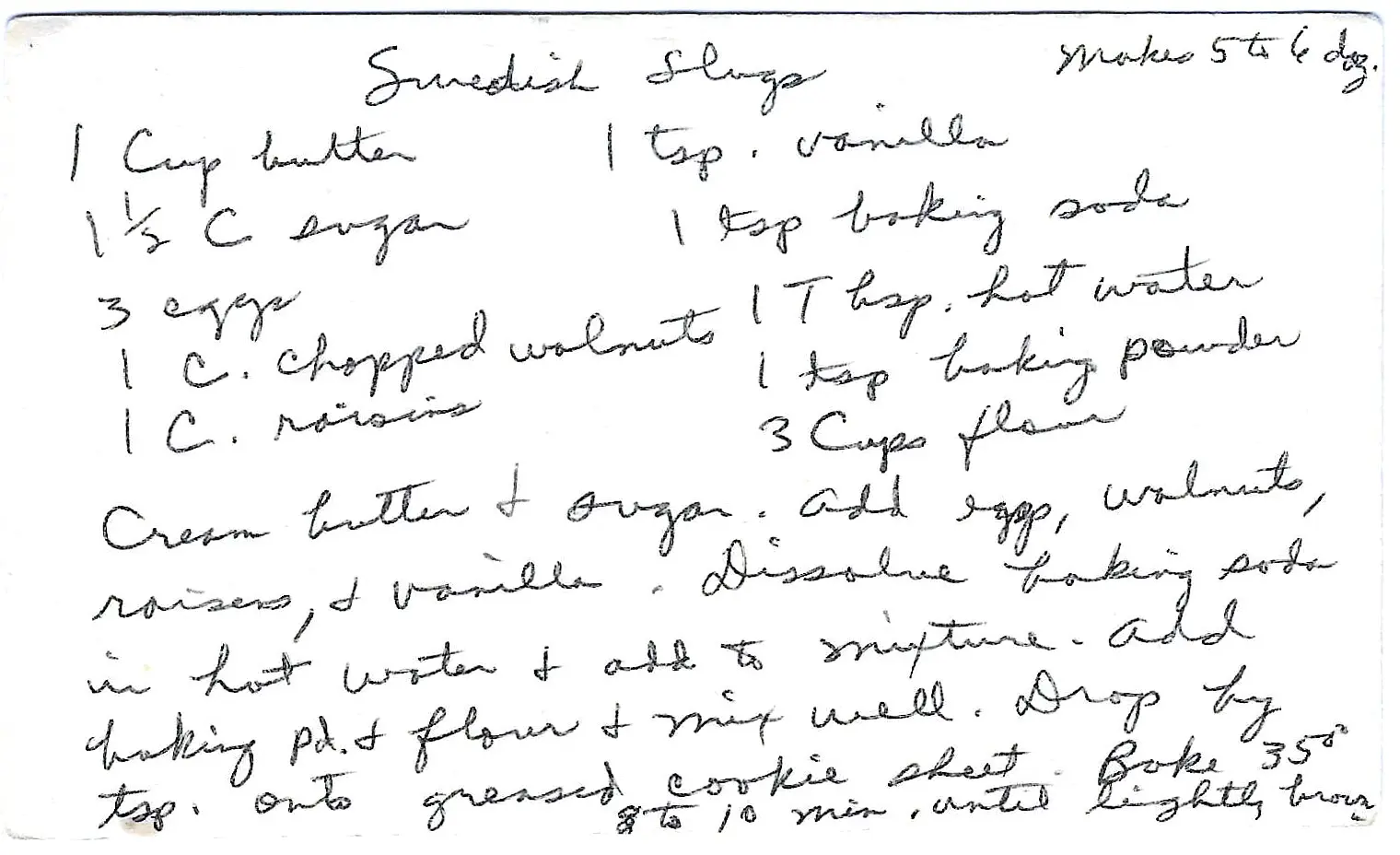 A classic recipe for a hearty and chewy drop cookie, amusingly named ‘Swedish Slugs’. This simple batter is loaded with walnuts and raisins for a timeless, delicious treat.