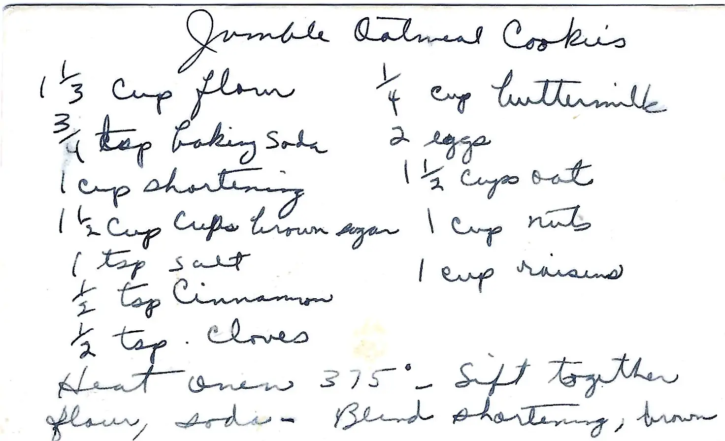 A classic, hearty oatmeal cookie packed with a ‘jumble’ of delicious ingredients, including raisins, nuts, and warm spices like cinnamon and cloves. These cookies are wonderfully moist and chewy thanks to the buttermilk.