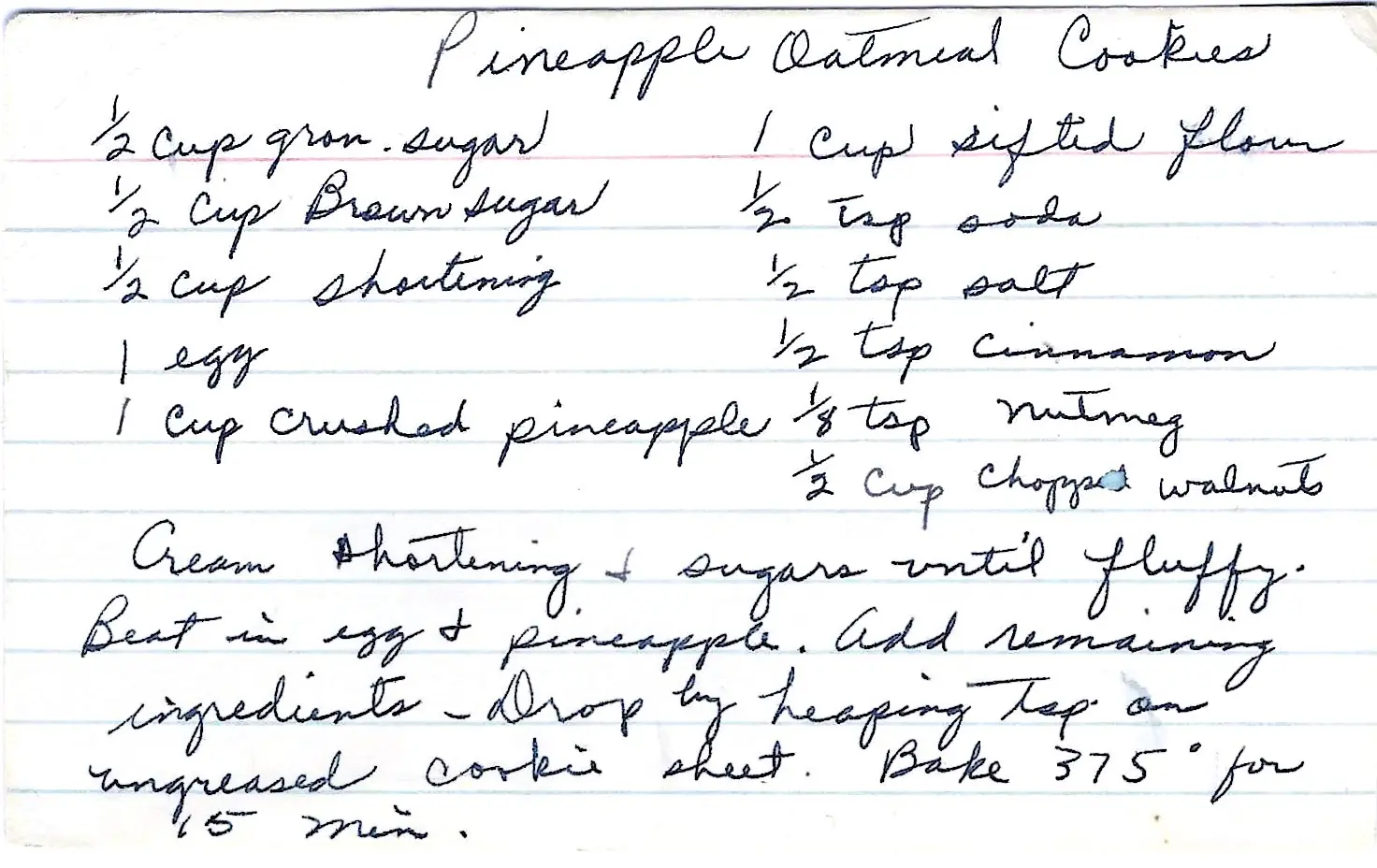 The original recipe card for these “Pineapple Oatmeal Cookies” was missing the oats! 1 ½ cups of oats have been added to create a complete and functional recipe.