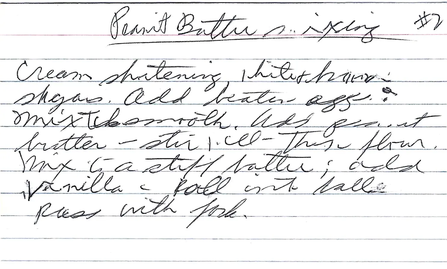 The original recipe card did not include measurements for the ingredients. Standard amounts for a classic peanut butter cookie have been added to create a complete and reliable recipe.