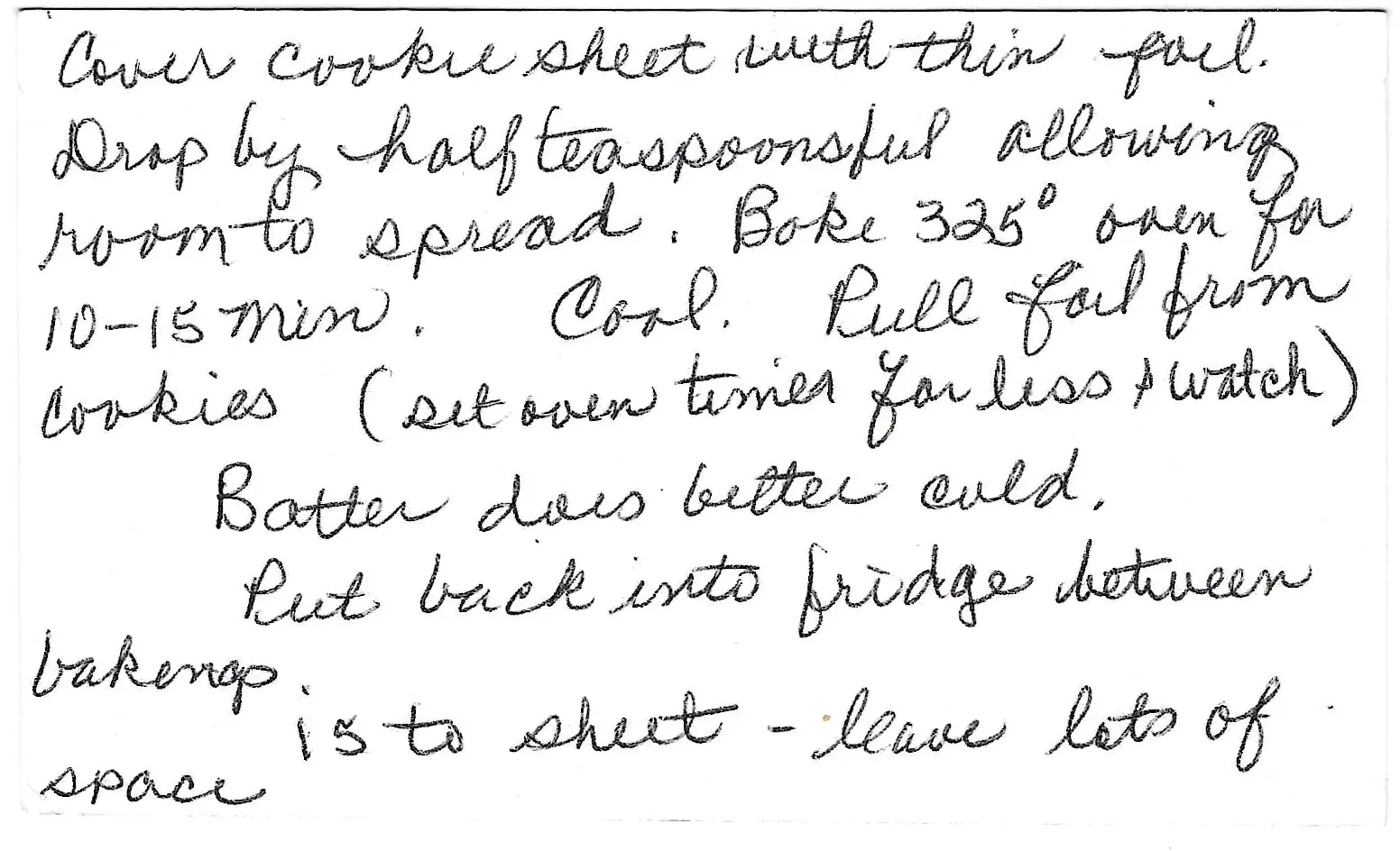 - Drop the cold batter by half-teaspoonfuls, leaving plenty of room (at least 3-4 inches) for the cookies to spread.