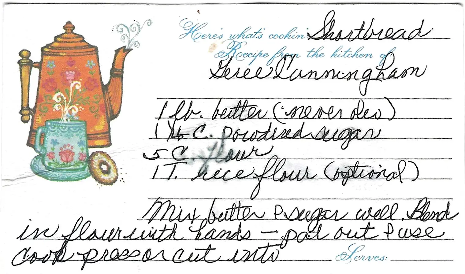 The author is very clear: use real butter, never margarine (“Oleo”). The optional rice flour is a traditional ingredient that gives shortbread a sandier, more delicate texture.