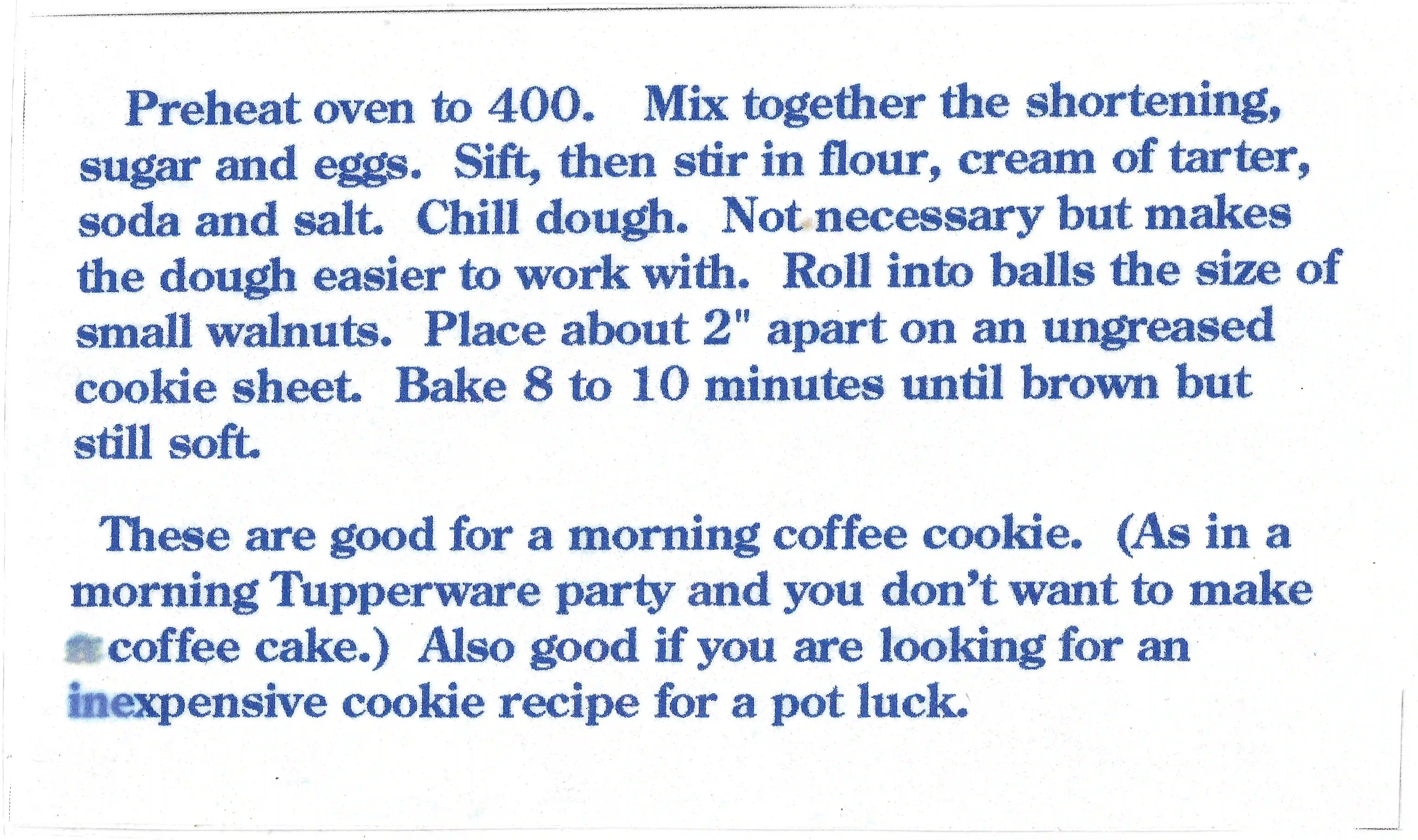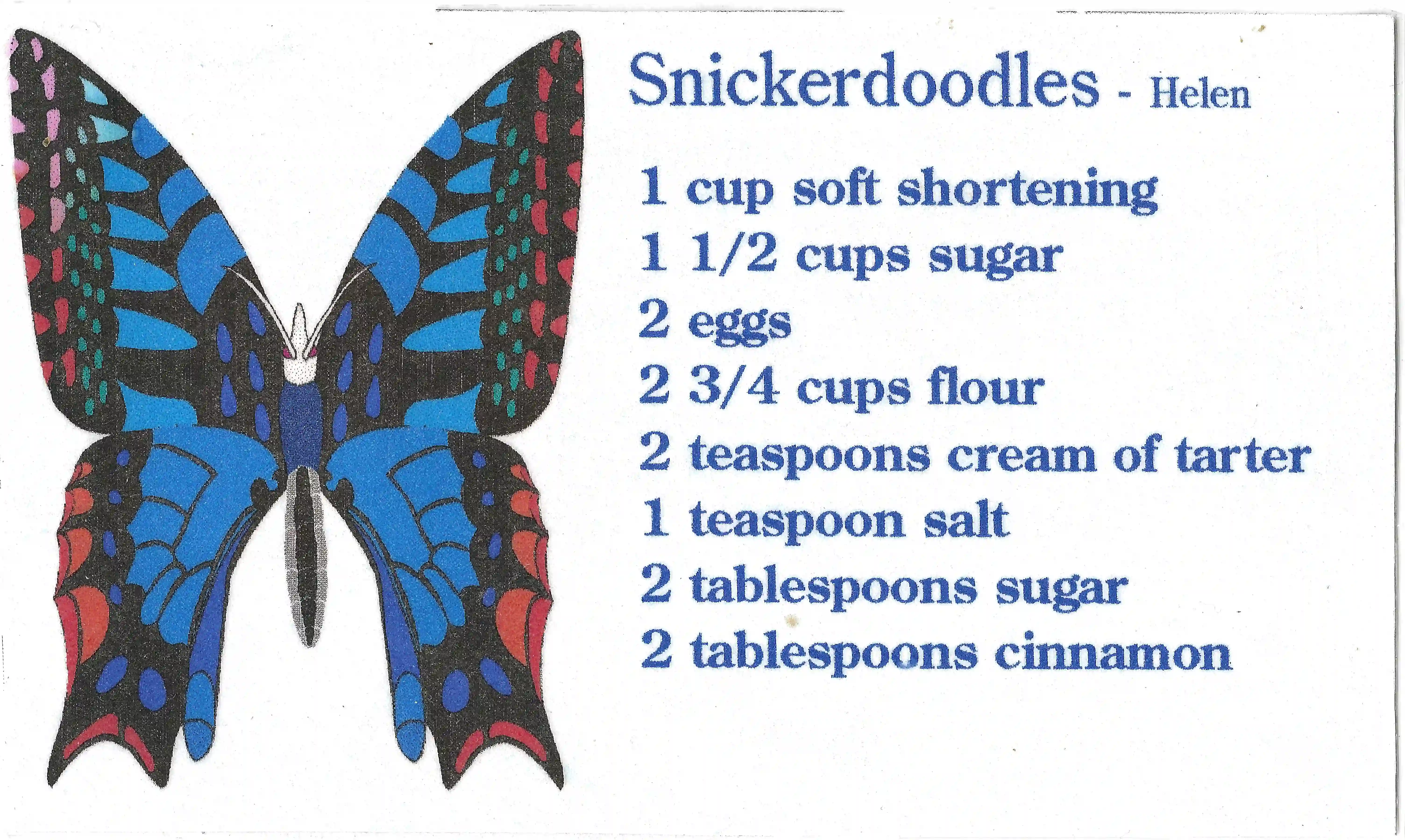 The original recipe card is missing the measurement for baking soda in the ingredient list, but it is mentioned in the instructions. 1 teaspoon has been added, as this is a standard amount for snickerdoodles and is essential for their texture.