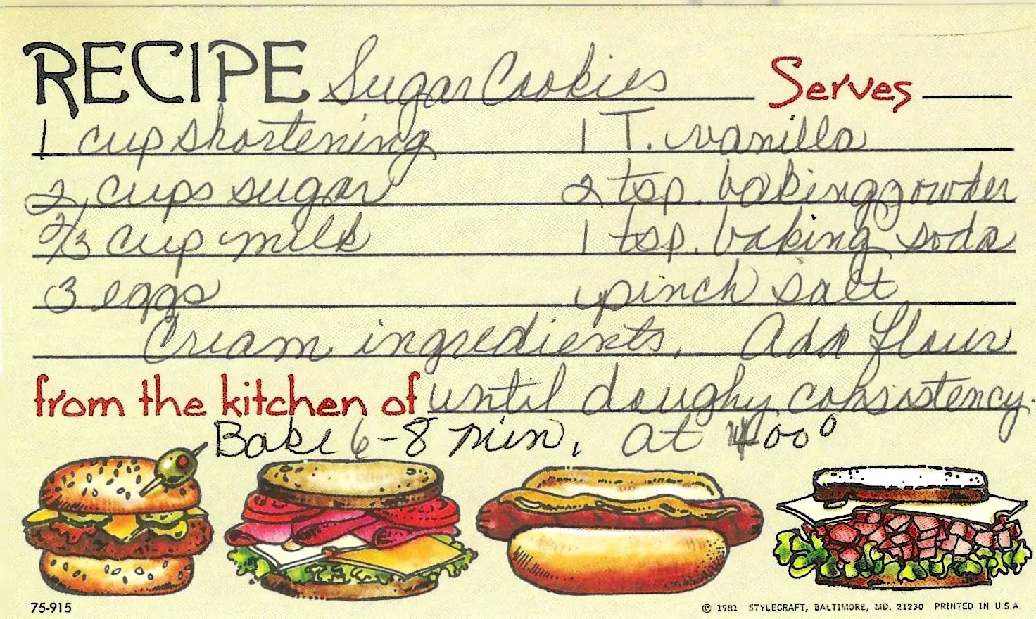 The original recipe card did not specify an amount for flour, only “to doughy consistency.” 5 cups has been added as a standard measurement for a recipe of this size to create a soft, rollable dough.