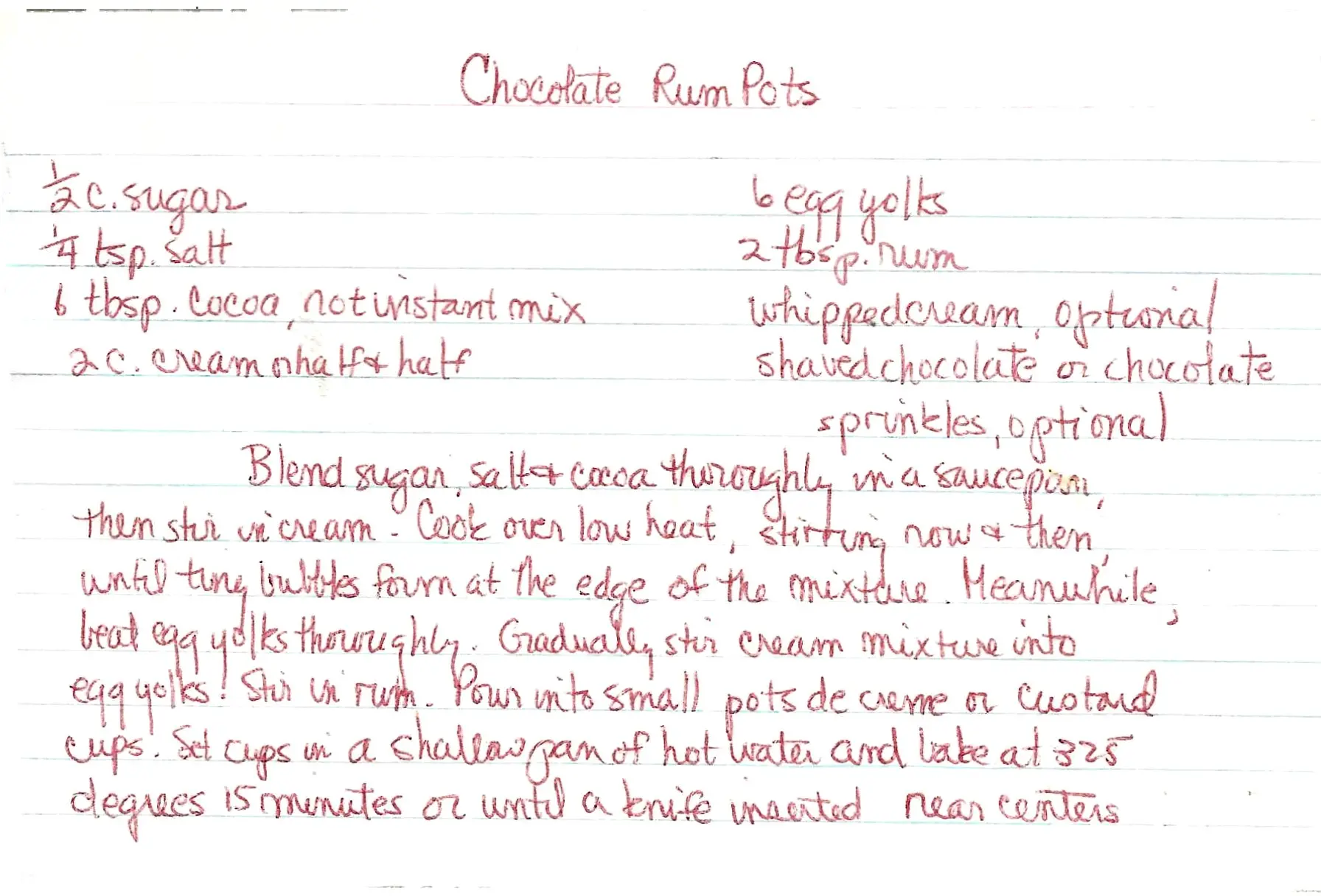 A rich and sophisticated baked chocolate custard infused with a hint of rum, perfect for a special occasion.
