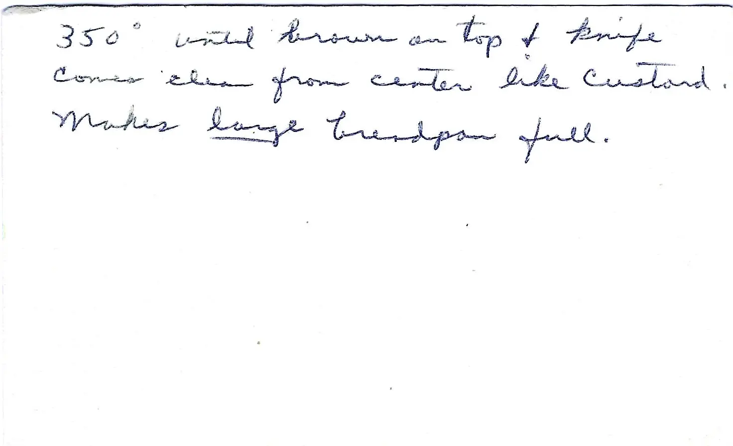 - Bake at 350°F for 45 minutes to an hour, until brown on top and a knife inserted in the center comes out clean.