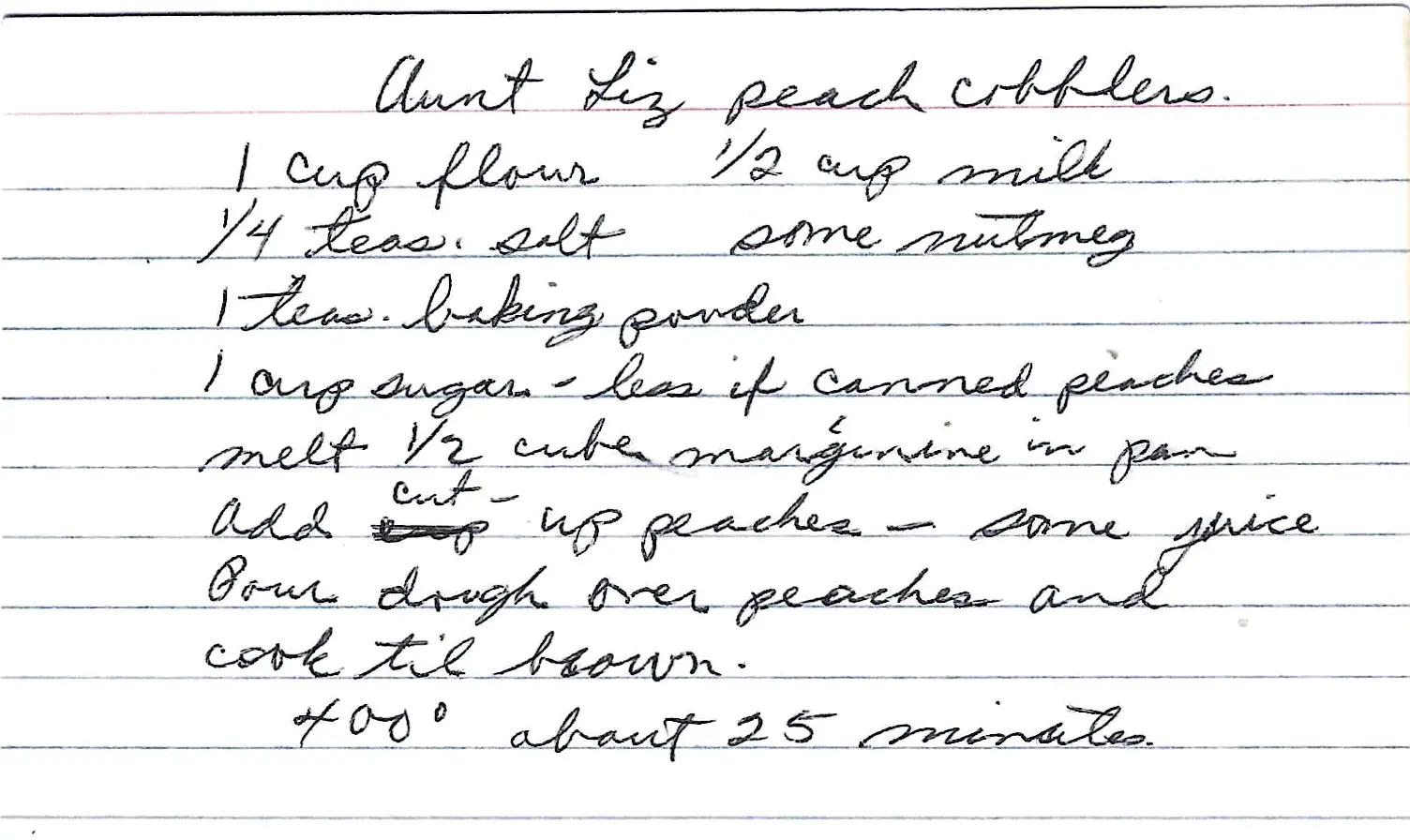 The amount of sugar can be reduced if using canned peaches. The card mentions adding “some spice” to the peaches.