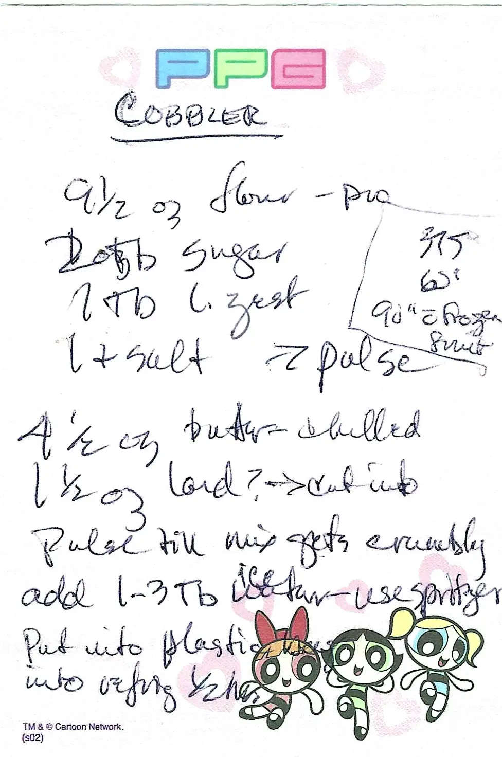 The recipe card is written on Powerpuff Girls (PPG) stationery. The instructions for assembling the final cobbler are not specified and have been inferred.