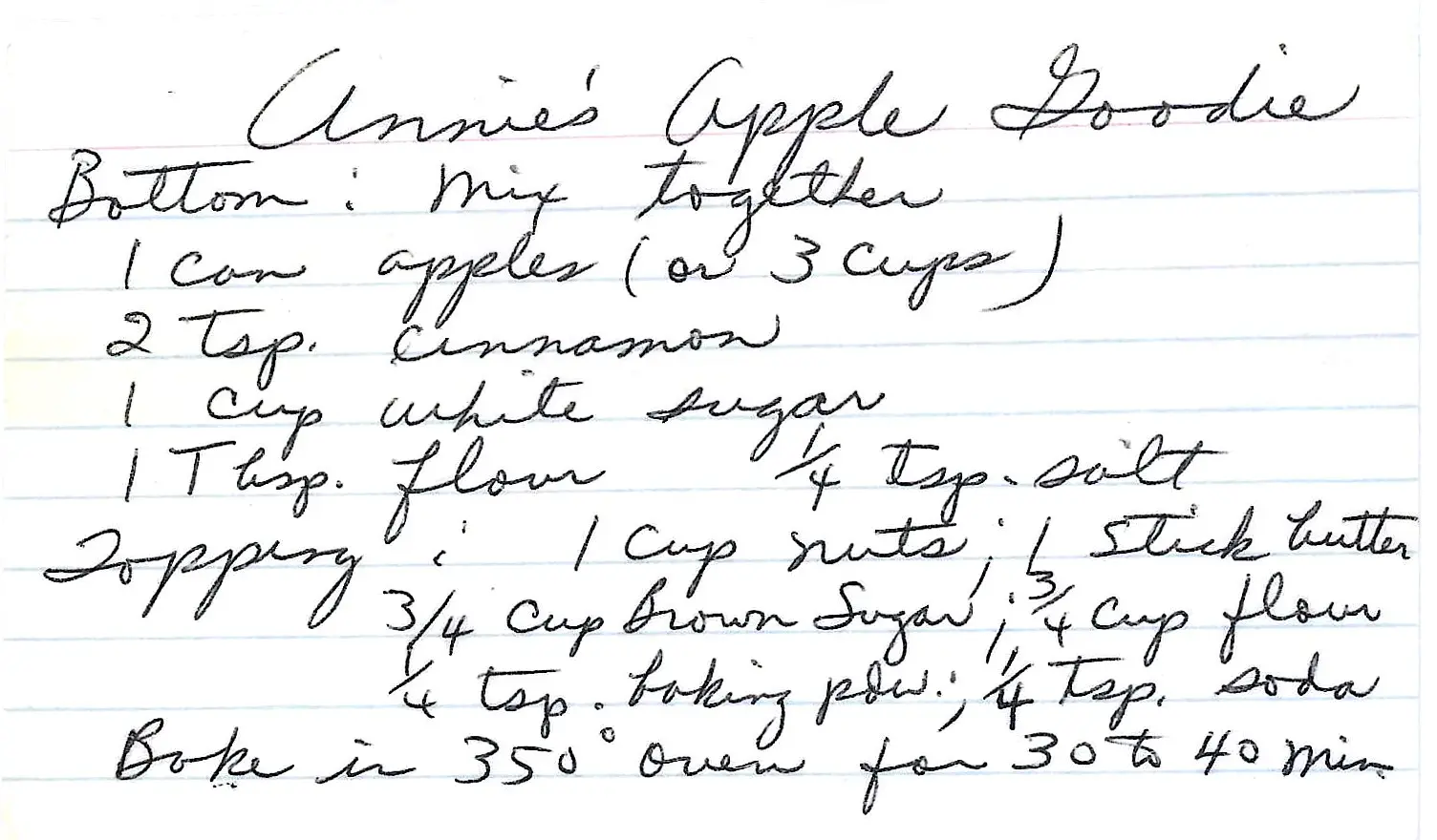 A classic and comforting apple crisp (or “goodie”) with a tender, spiced apple filling and a crumbly, buttery nut topping.