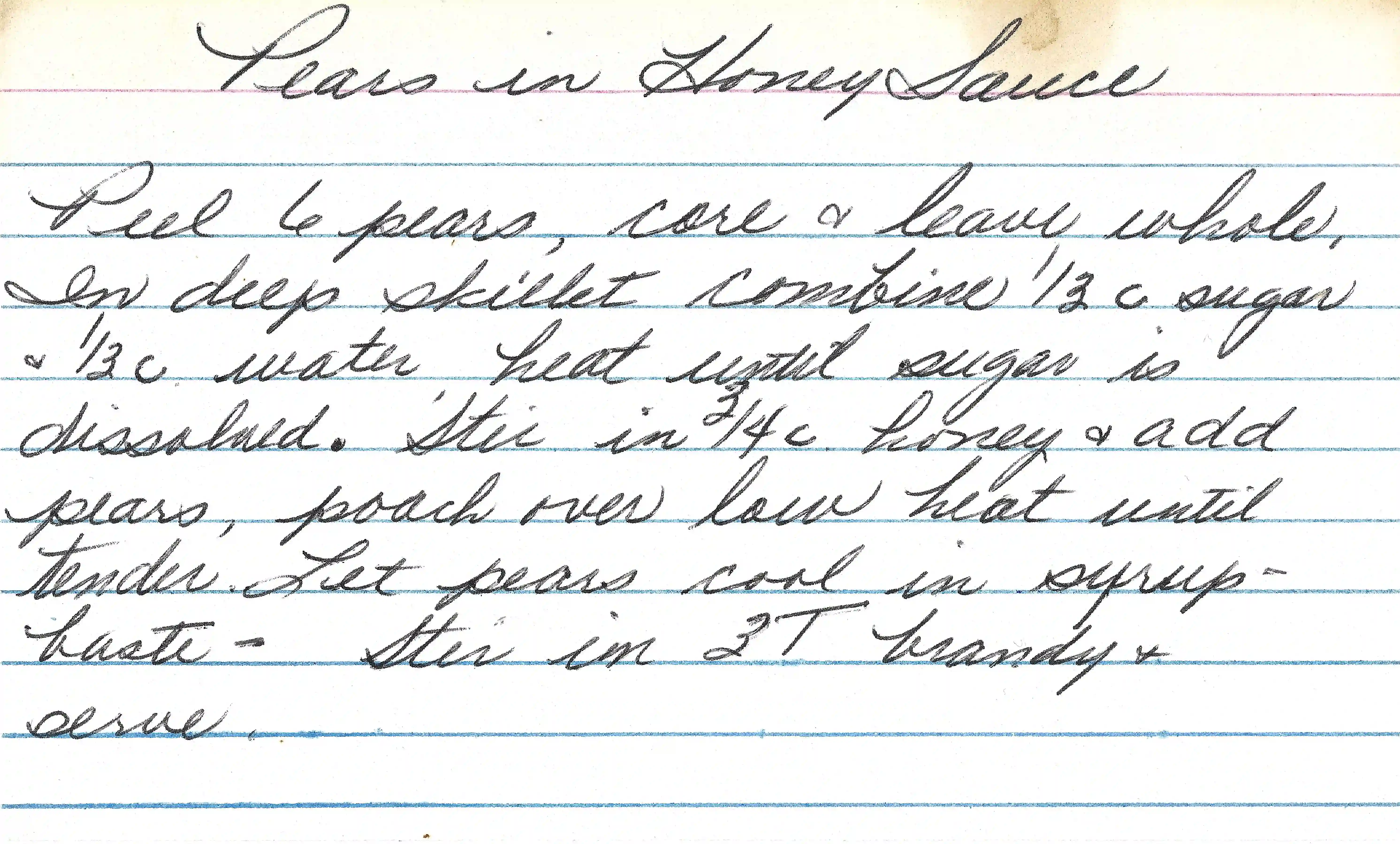An elegant dessert of whole pears poached in a simple honey syrup and finished with a splash of brandy.