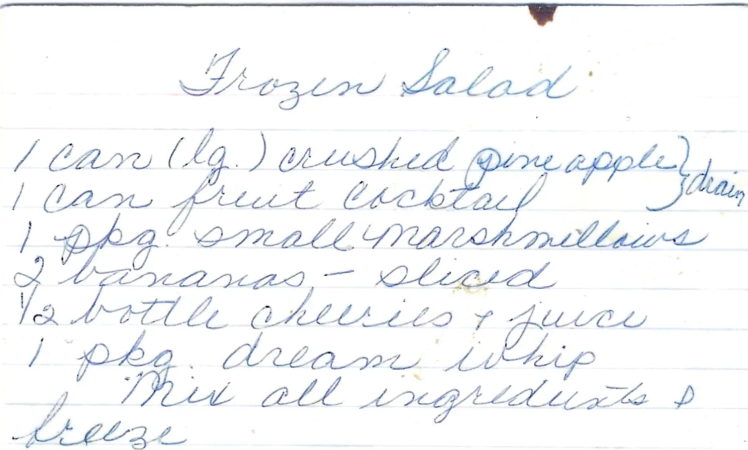 - Gently fold in the crushed pineapple (with its juice), the drained fruit cocktail, small marshmallows, sliced bananas, and the cherries with their juice.