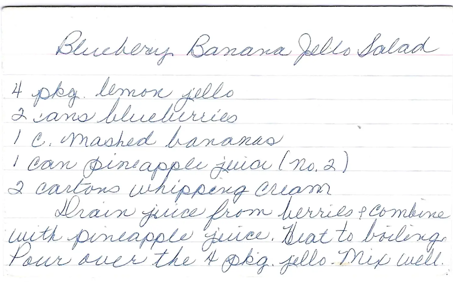 A classic, fluffy Jello salad made by folding blueberries, bananas, and whipped cream into a lemon Jello base. Perfect for serving a crowd.