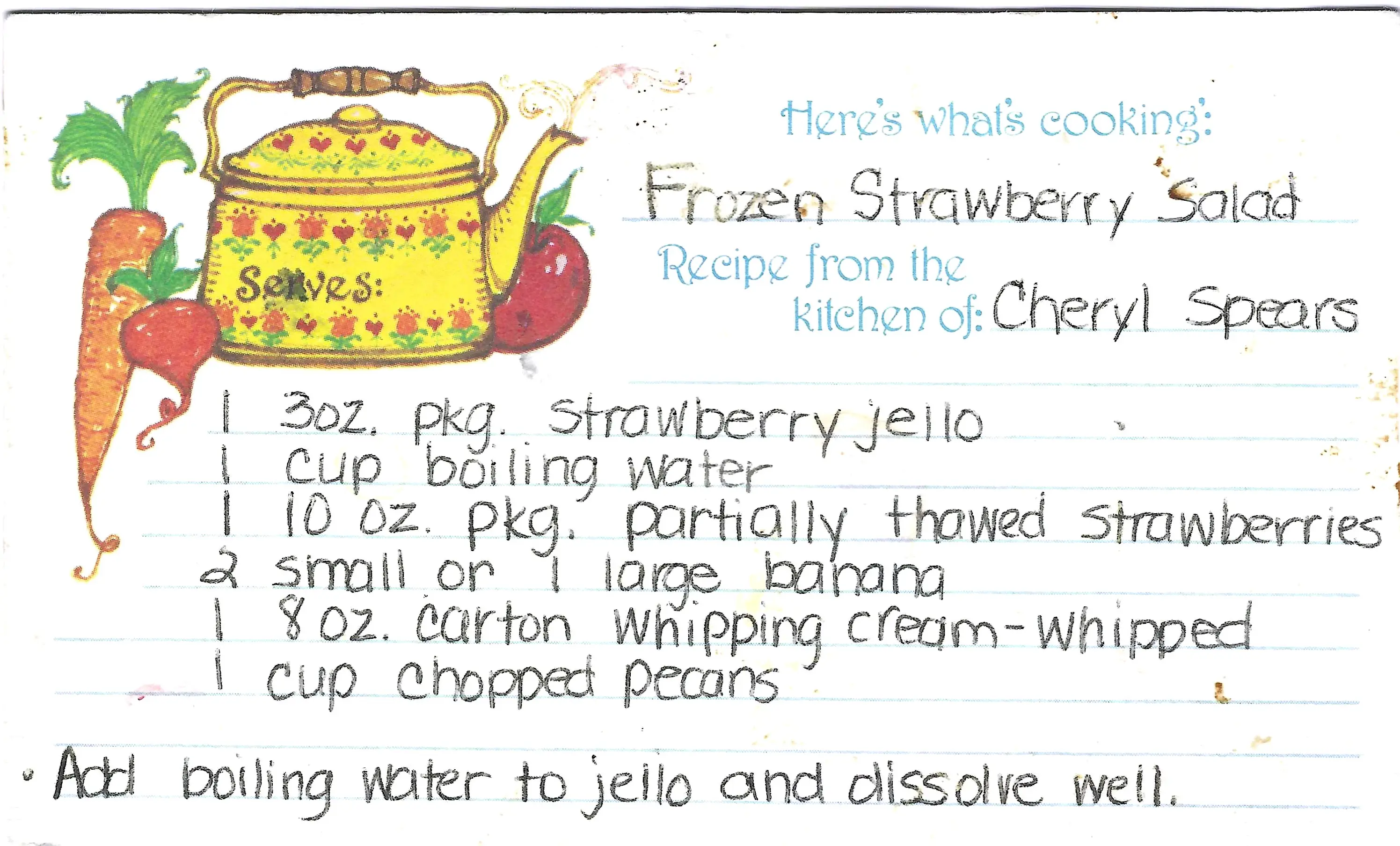 A classic frozen salad featuring strawberries, bananas, and pecans in a fluffy Jello and whipped cream base.
