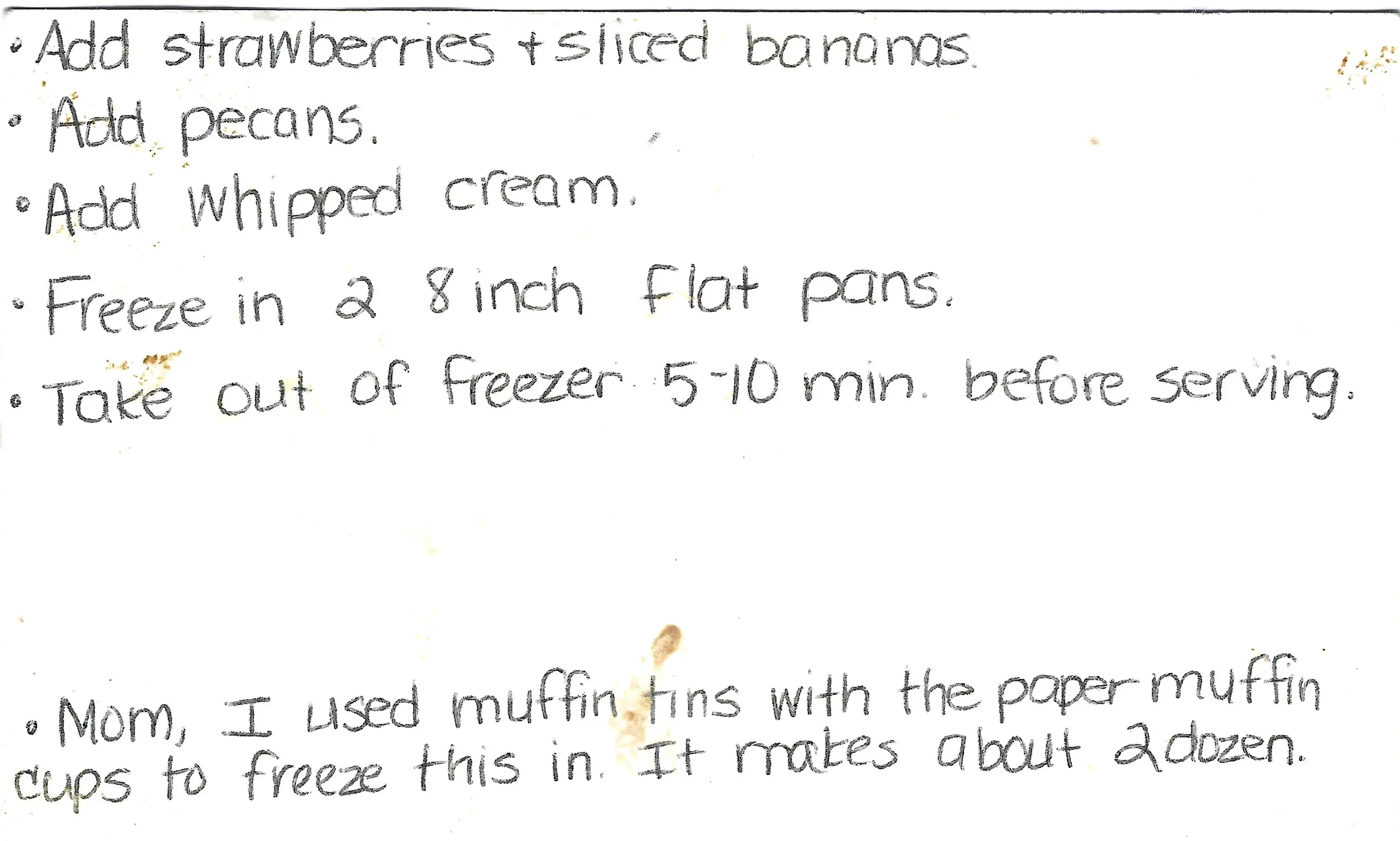 The recipe card’s author notes: “Mom, I used muffin tins with the paper muffin cups to freeze this in. It makes about 2 dozen.”