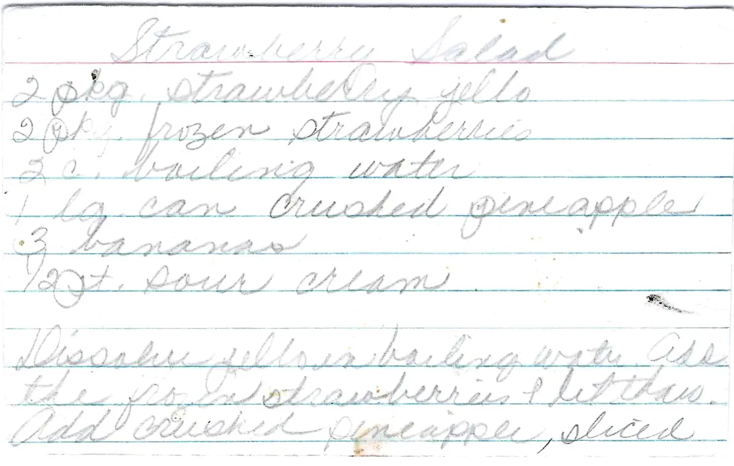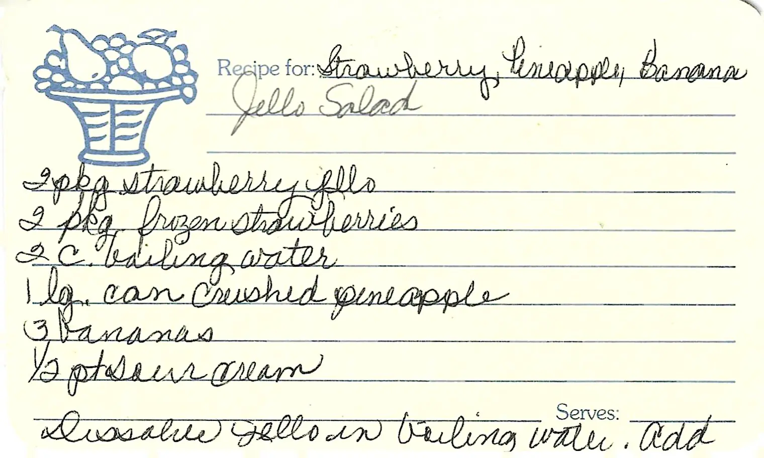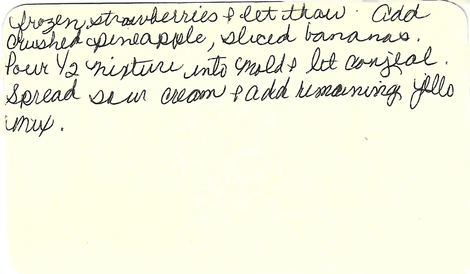 A classic layered Jello salad with a tangy sour cream filling, packed with strawberries, pineapple, and bananas.