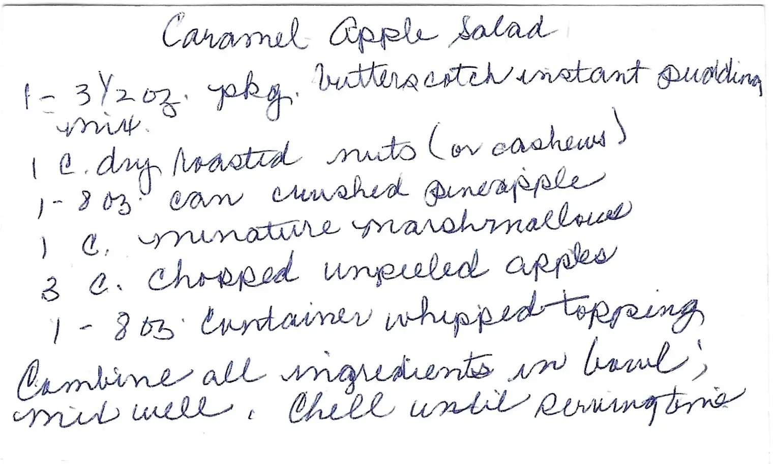 - In a large bowl, combine the dry butterscotch instant pudding mix, nuts, the entire can of undrained crushed pineapple, miniature marshmallows, chopped unpeeled apples, and the thawed whipped topping.