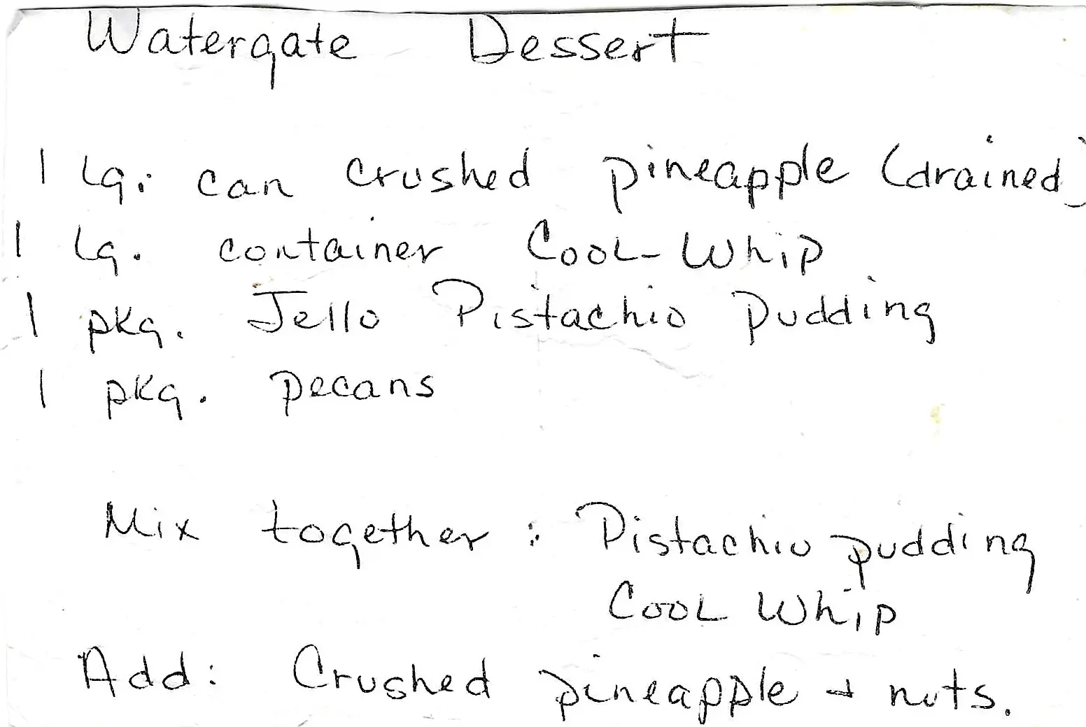 This simple dessert is also known as “Pistachio Delight” or “Green Fluff.” Many variations also include one to two cups of mini marshmallows, folded in with the pineapple and nuts.