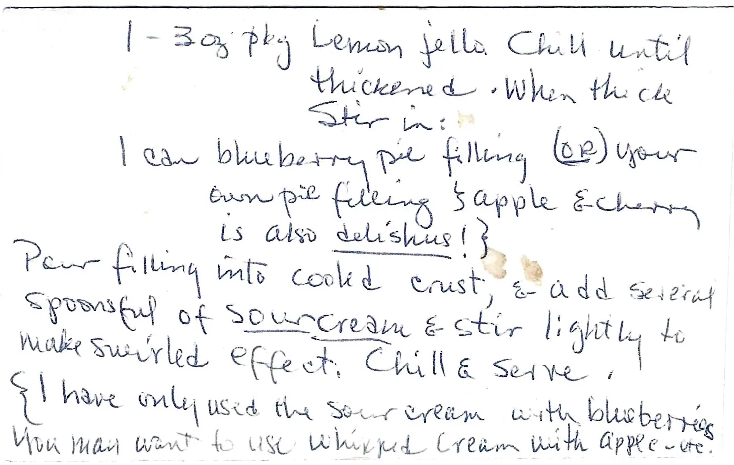 You can substitute other pie fillings; the author notes that apple and cherry are also delicious. The author also suggests, “I have only used the sour cream with blueberries. You may want to use whipped cream with apple, etc.”