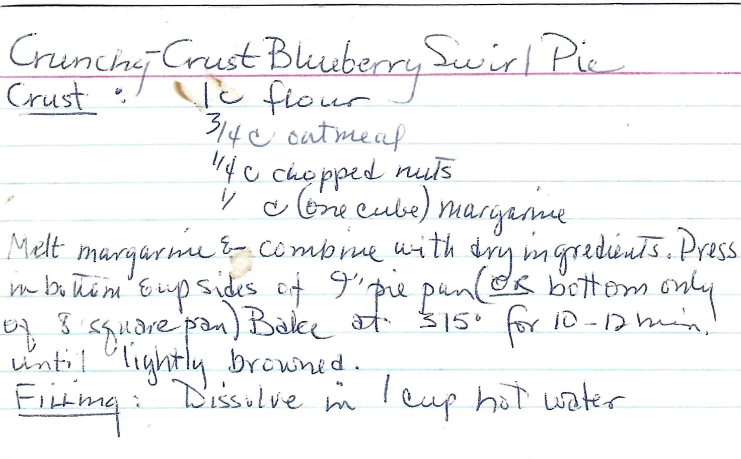 - For the Crust: Preheat the oven to 375°F. Combine the flour, oatmeal, and chopped nuts. Add the melted margarine and mix. Press into a 9-inch pie pan and bake for 10-12 minutes. Let cool completely.