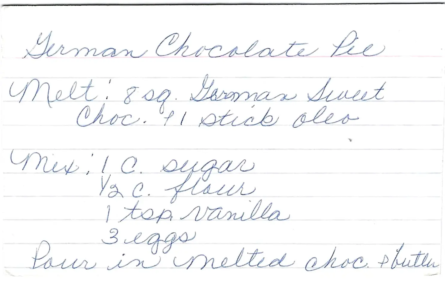 - In a small saucepan, melt the German Sweet Chocolate and oleo together. Set aside to cool slightly.