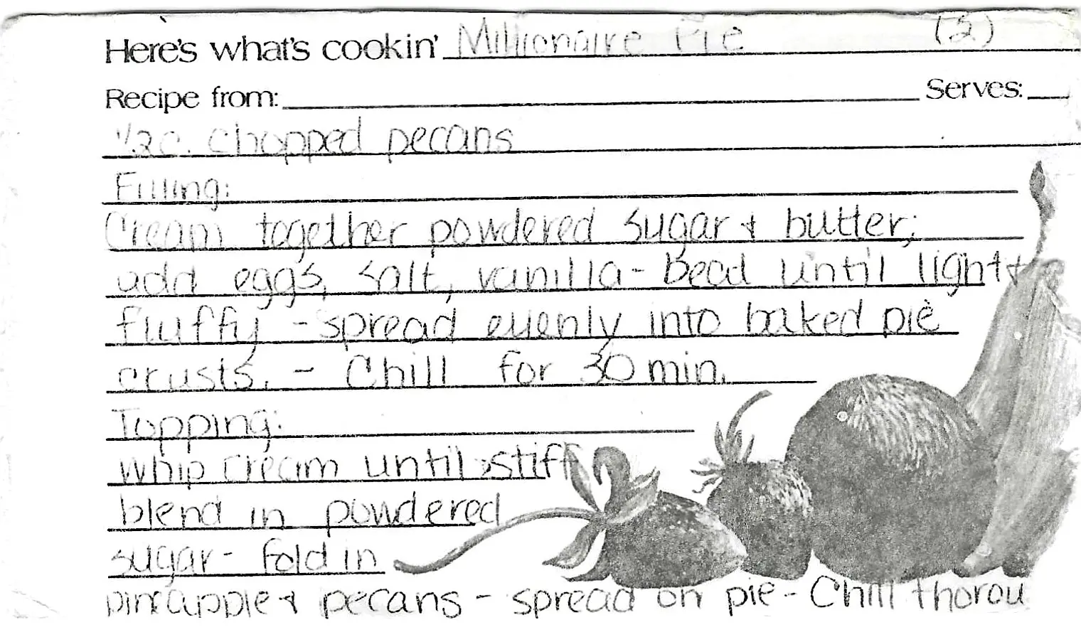 The original recipe card was missing most quantities. The amounts listed here are based on a standard, classic recipe for this style of pie to make it complete and usable.