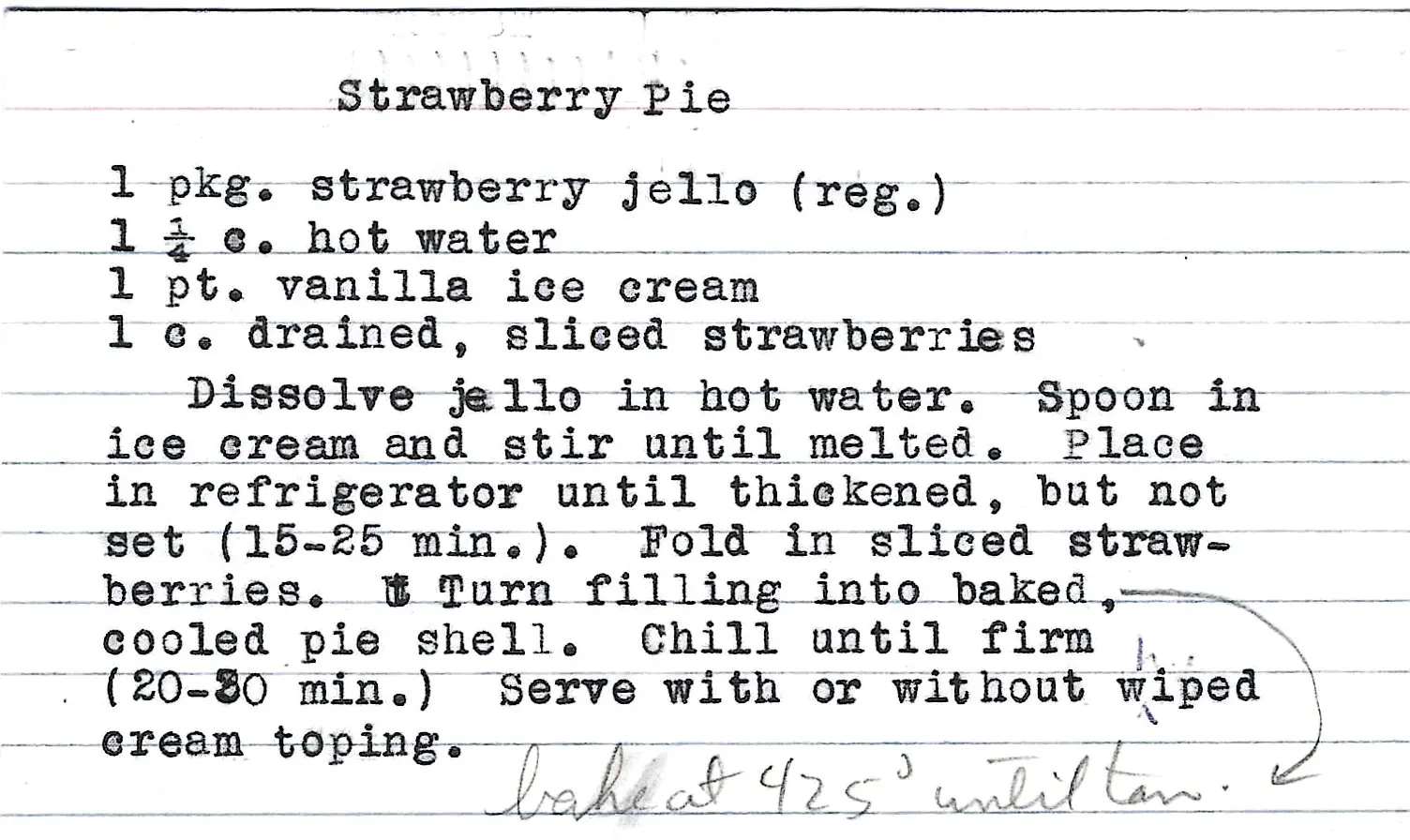 The note “bake at 425 until tan” on the recipe card refers to the instructions for pre-baking the pie shell before you begin making the filling.