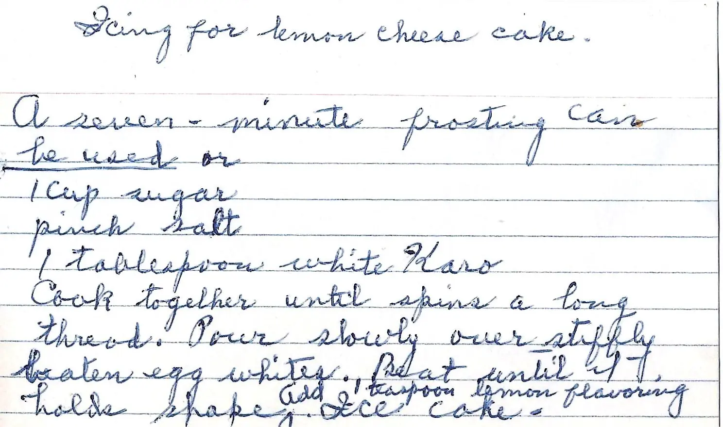 The original card reads: “A seven-minute frosting can be used, or… Cook [sugar, salt, Karo] together until spins a long thread. Pour slowly over stiffly beaten egg whites. Beat until it holds shape. Add 1 teaspoon lemon flavoring. Ice cake.” The number of egg whites and amount of water were missing and have been inferred.