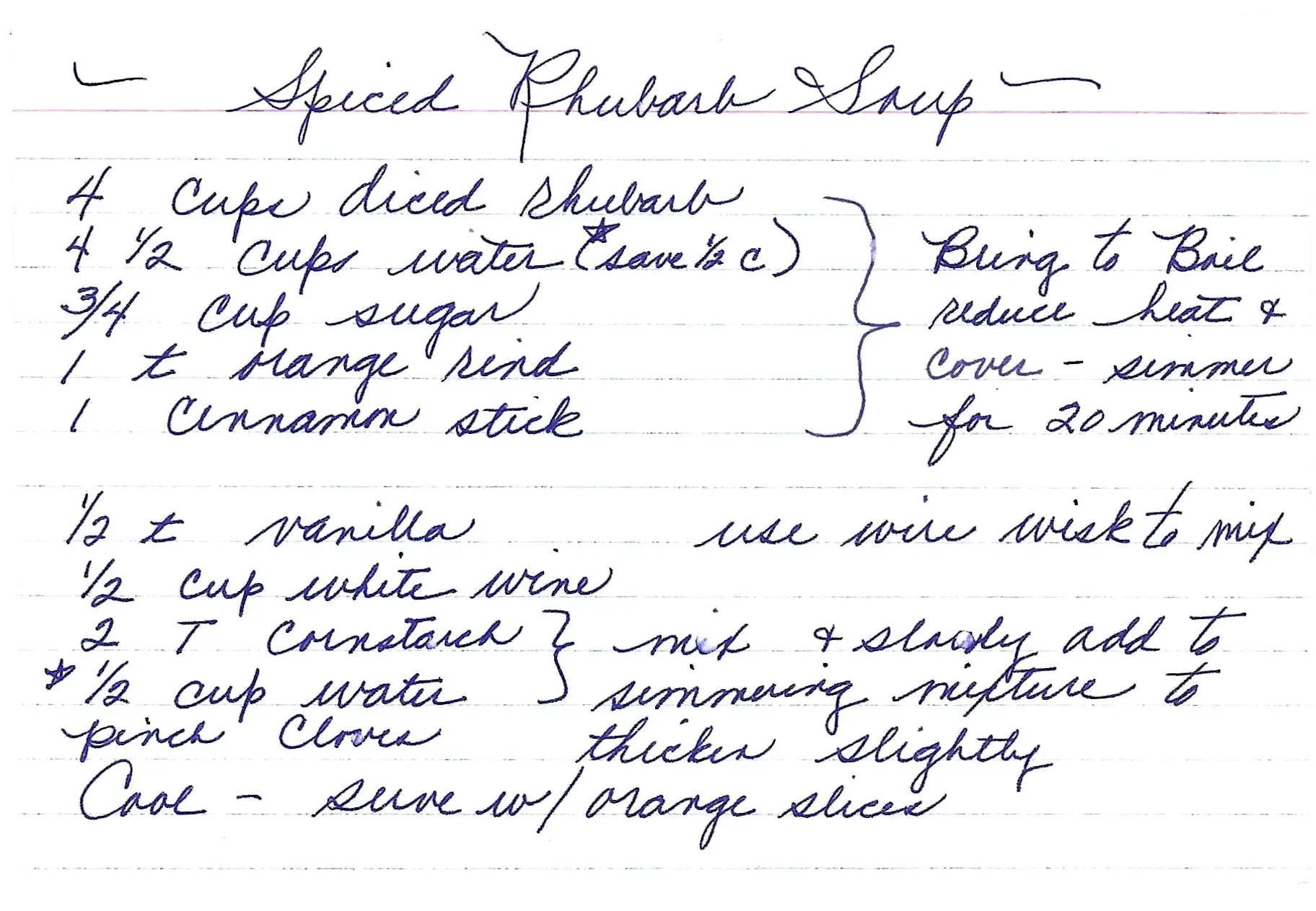 A refreshing and elegant chilled dessert soup, featuring the tartness of rhubarb balanced with warm spices and a hint of wine.