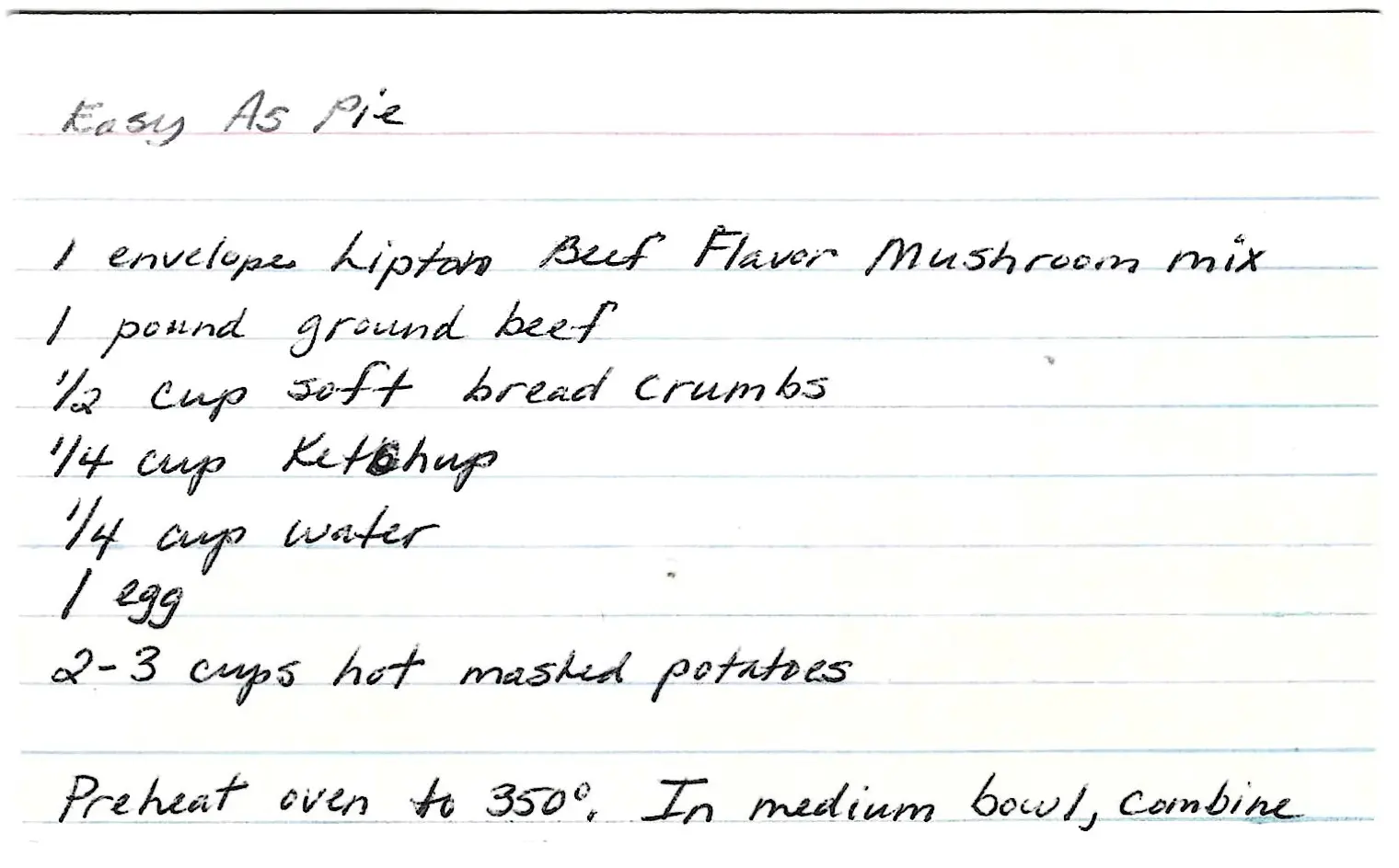 A classic and comforting main course, this “Easy As Pie” is a simple Shepherd’s (or Cottage) Pie with a savory meatloaf-like base and a mashed potato topping.