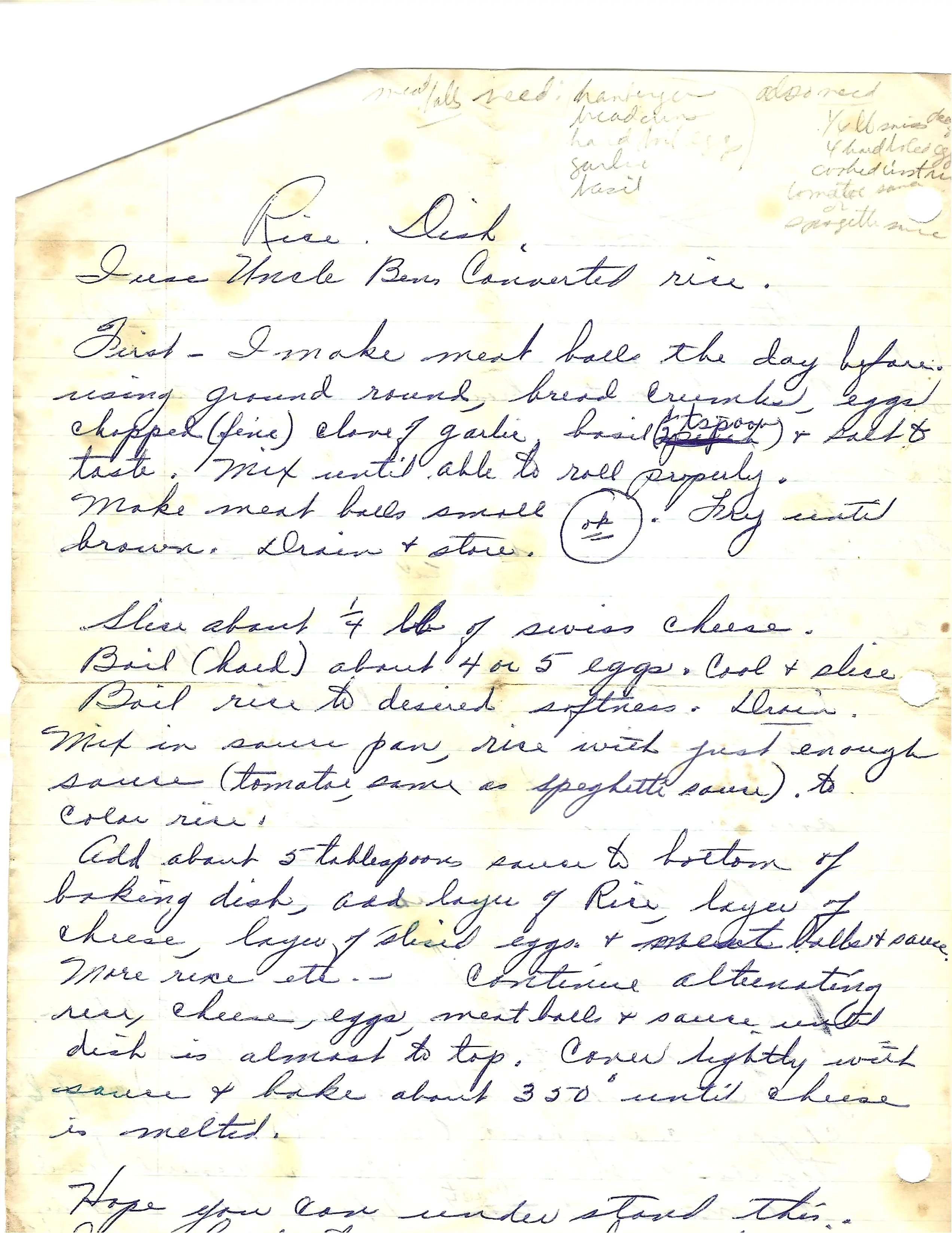 - Begin layering: a layer of the sauce-colored rice, a layer of Swiss cheese, a layer of sliced hard-boiled eggs, and a layer of meatballs.