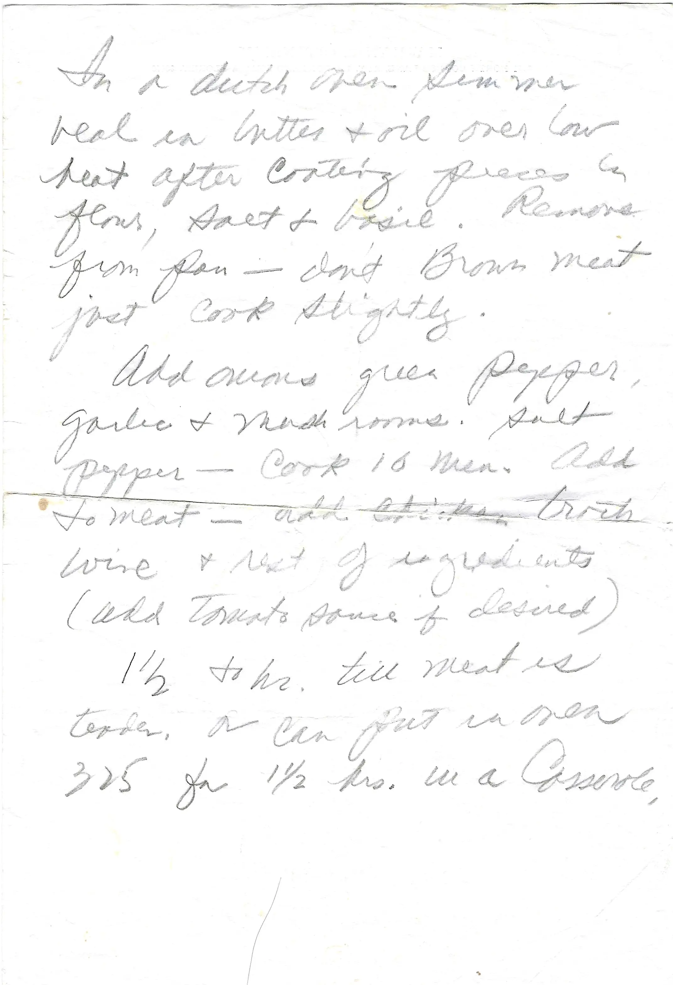 A hearty Veal Casserole from the kitchen of Marilyn B. Oppenheim. Cubed veal is lightly cooked then simmered with onions, peppers, mushrooms, and herbs in a white wine and chicken broth sauce.