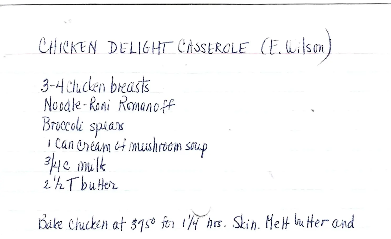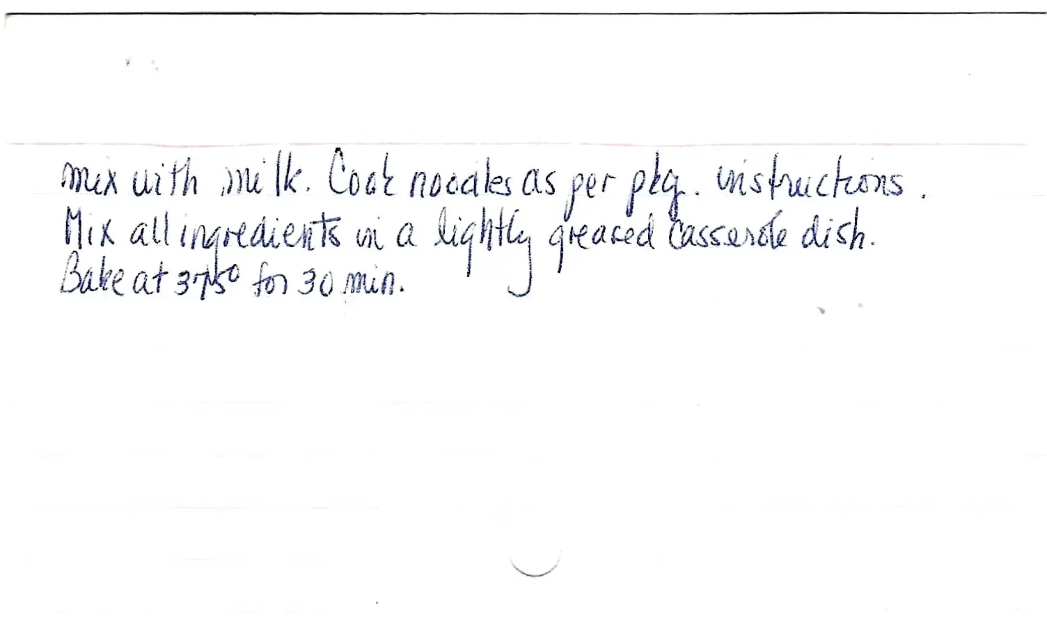 - Melt butter. (The original note is slightly cut off, but typically the melted butter would be used for the casserole, perhaps to sauté something or mix with breadcrumbs if used, though breadcrumbs are not listed).