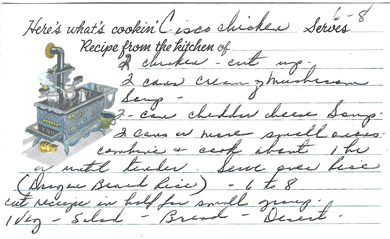 The recipe card suggests using Oregon Brand Rice and notes that you can “cut recipe in half for small group.” It also suggests serving the meal with a vegetable, salad, bread, and dessert.