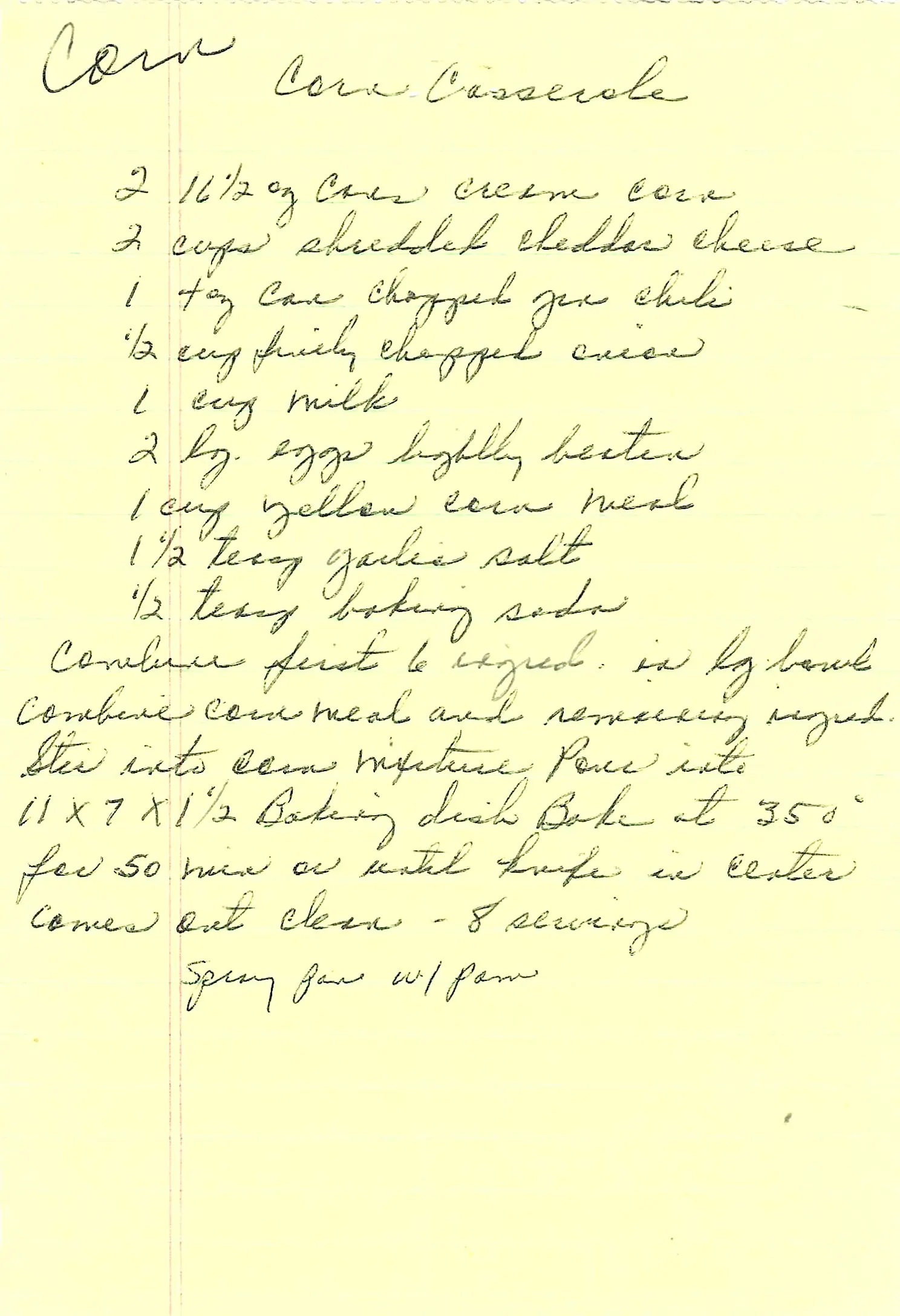 - In a large bowl, combine the cream corn, cheddar cheese, green chiles, onion, milk, and beaten eggs.