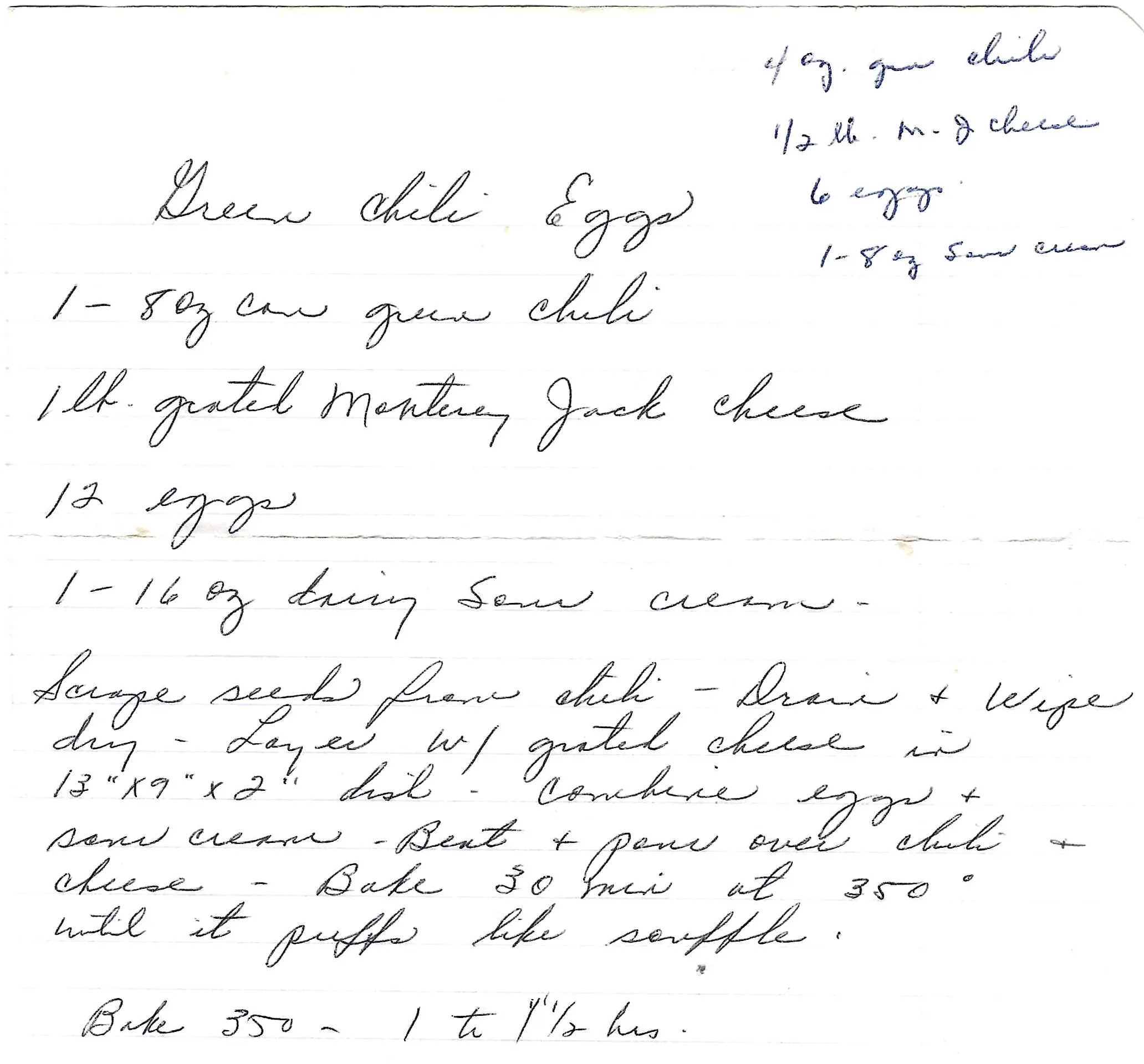 A wonderfully simple and fluffy egg casserole that “puffs up like a soufflé,” with layers of green chiles and Monterey Jack cheese.