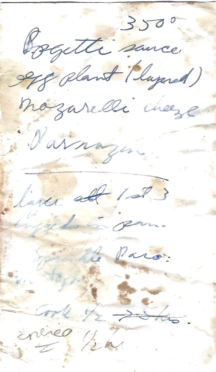 The recipe card does not specify a baking time. A standard bake time of 35-45 minutes at 350°F is recommended to ensure the eggplant cooks through.