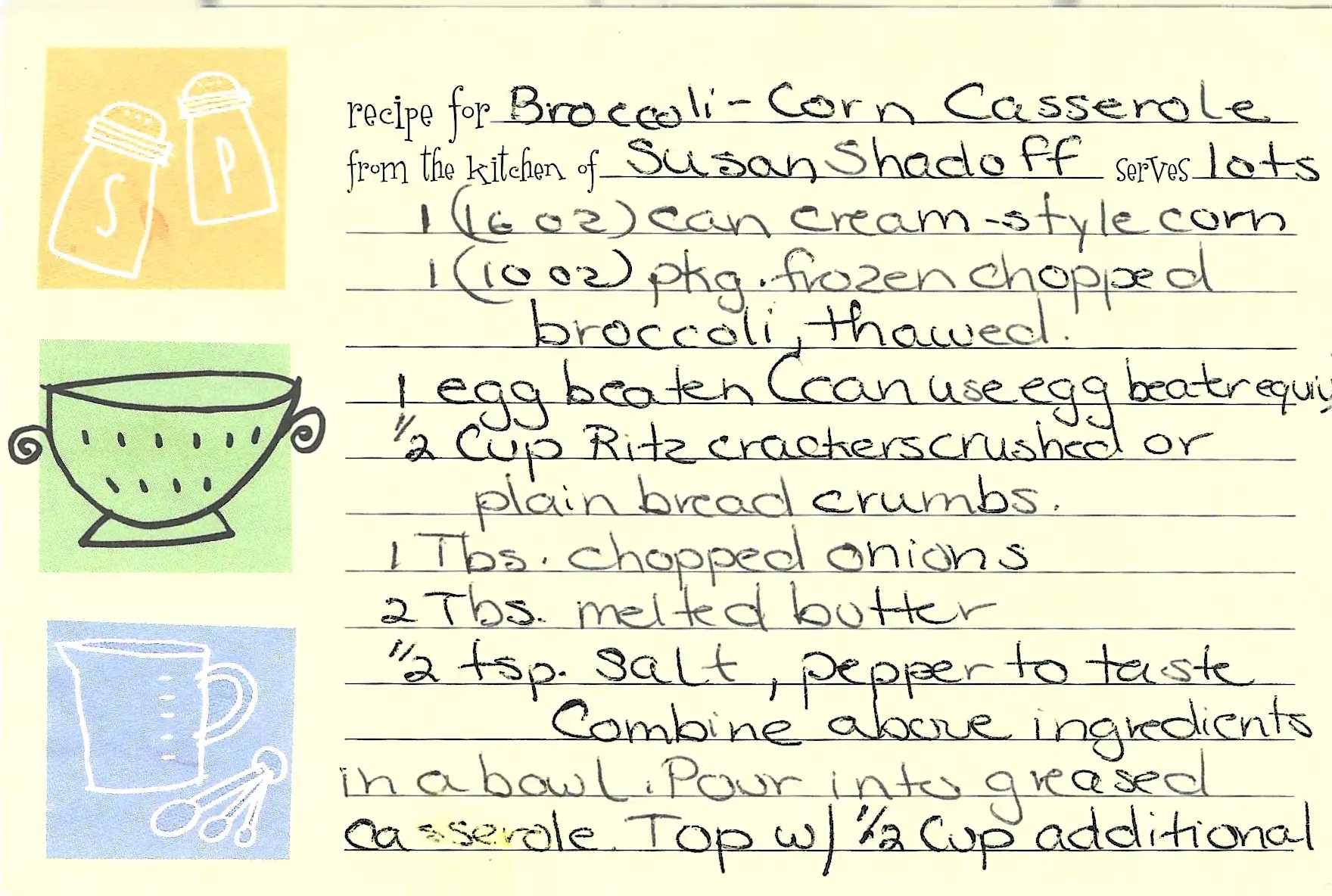 A classic and comforting side dish from Susan Shadoff, this casserole features cream-style corn and chopped broccoli baked in a savory custard with a buttery cracker crumb topping.