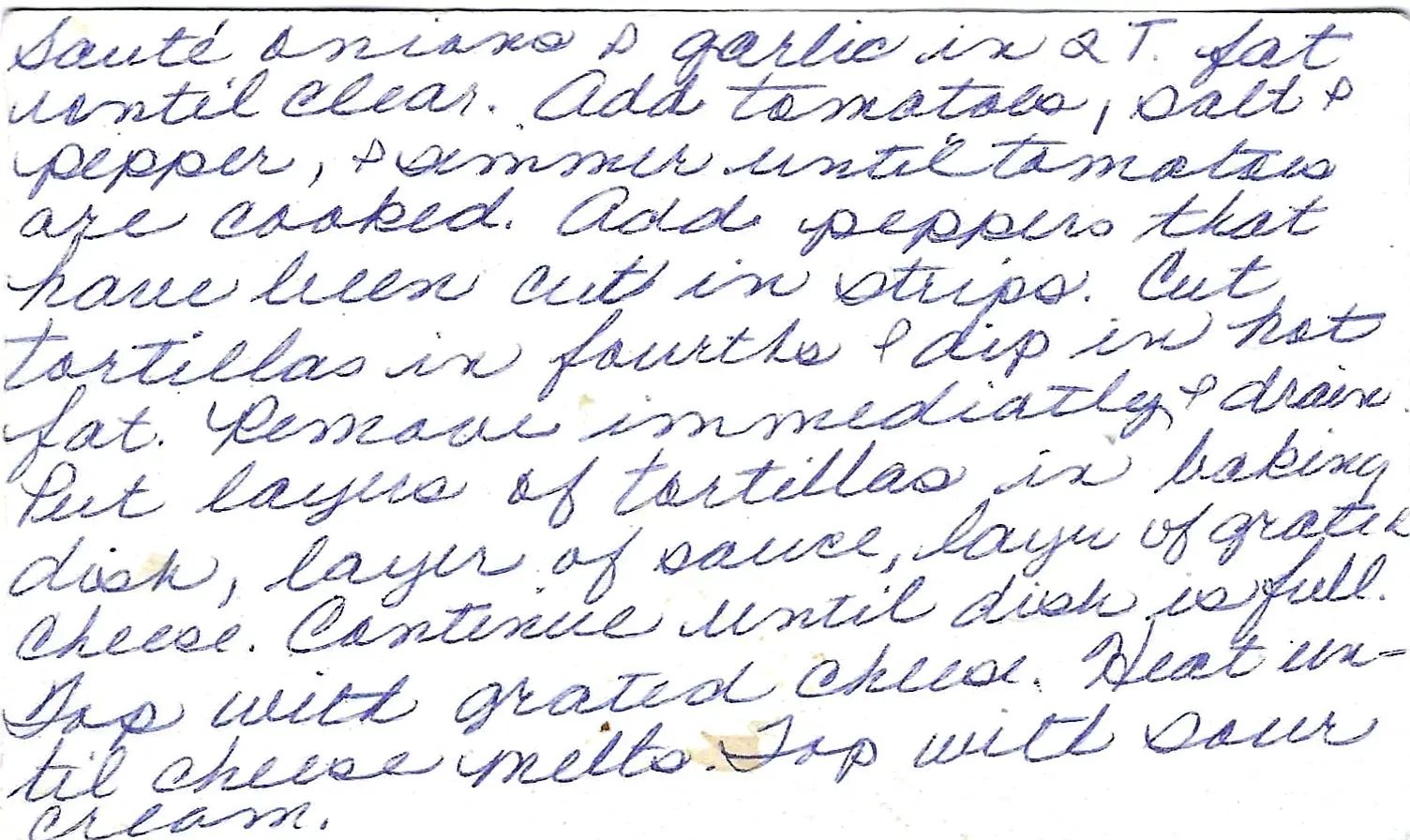 The instruction to “dip in hot fat” is a classic method to soften the tortillas and prevent them from getting mushy in the baked dish.