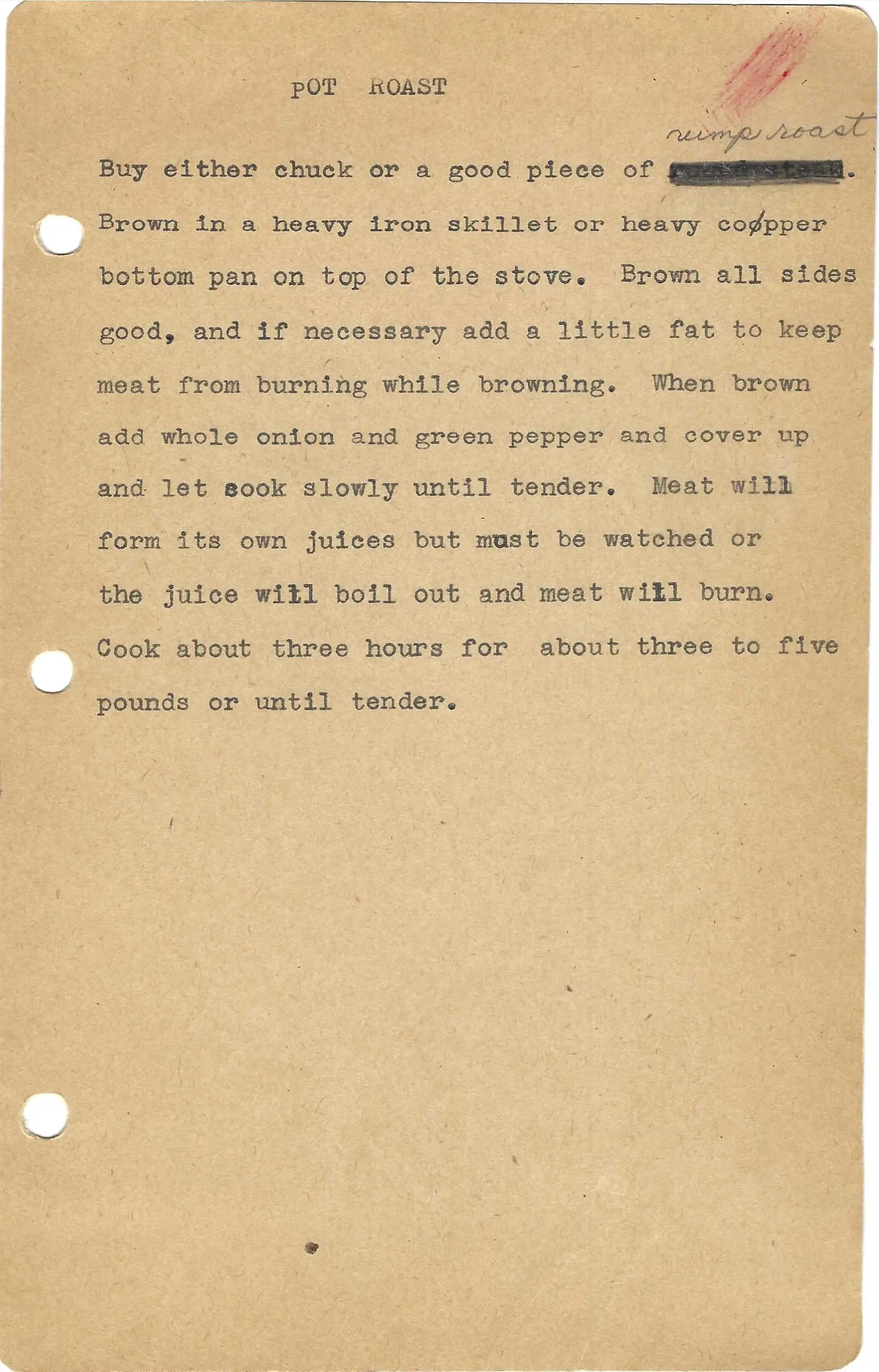 A handwritten note on the card suggests “rump roast” as an option for the cut of meat.
