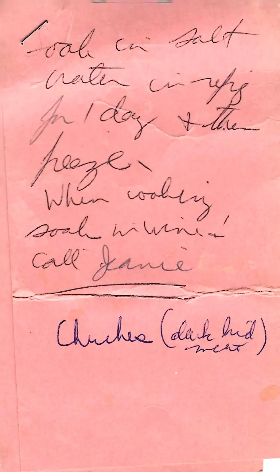 1. Soak the meat in salt water in the refrigerator for one day. 2. After soaking, freeze the meat. 3. When ready to prepare, soak the frozen meat in wine. 4. Cut the meat as desired. 5. In a heavy pot or Dutch oven, sauté the meat in oil. 6. Pour off the excess oil. 7. Add Italian herbs, salt, and pepper to taste. 8. Add wine to the pot. 9. Cover and cook at 300°F for 1 to 1.5 hours, or until the meat is tender.