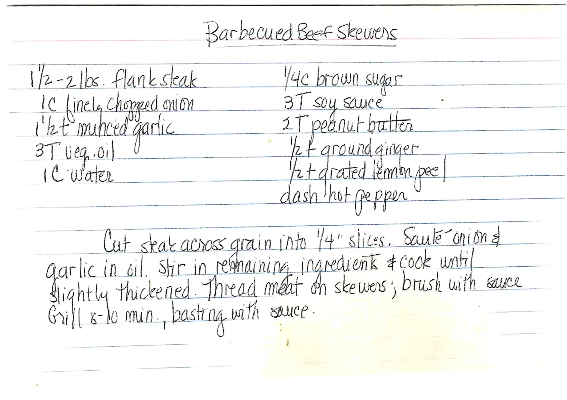 Tender flank steak skewers grilled to perfection and basted with a rich, savory sauce made from peanut butter, soy, ginger, and garlic. A fantastic satay-style dish.