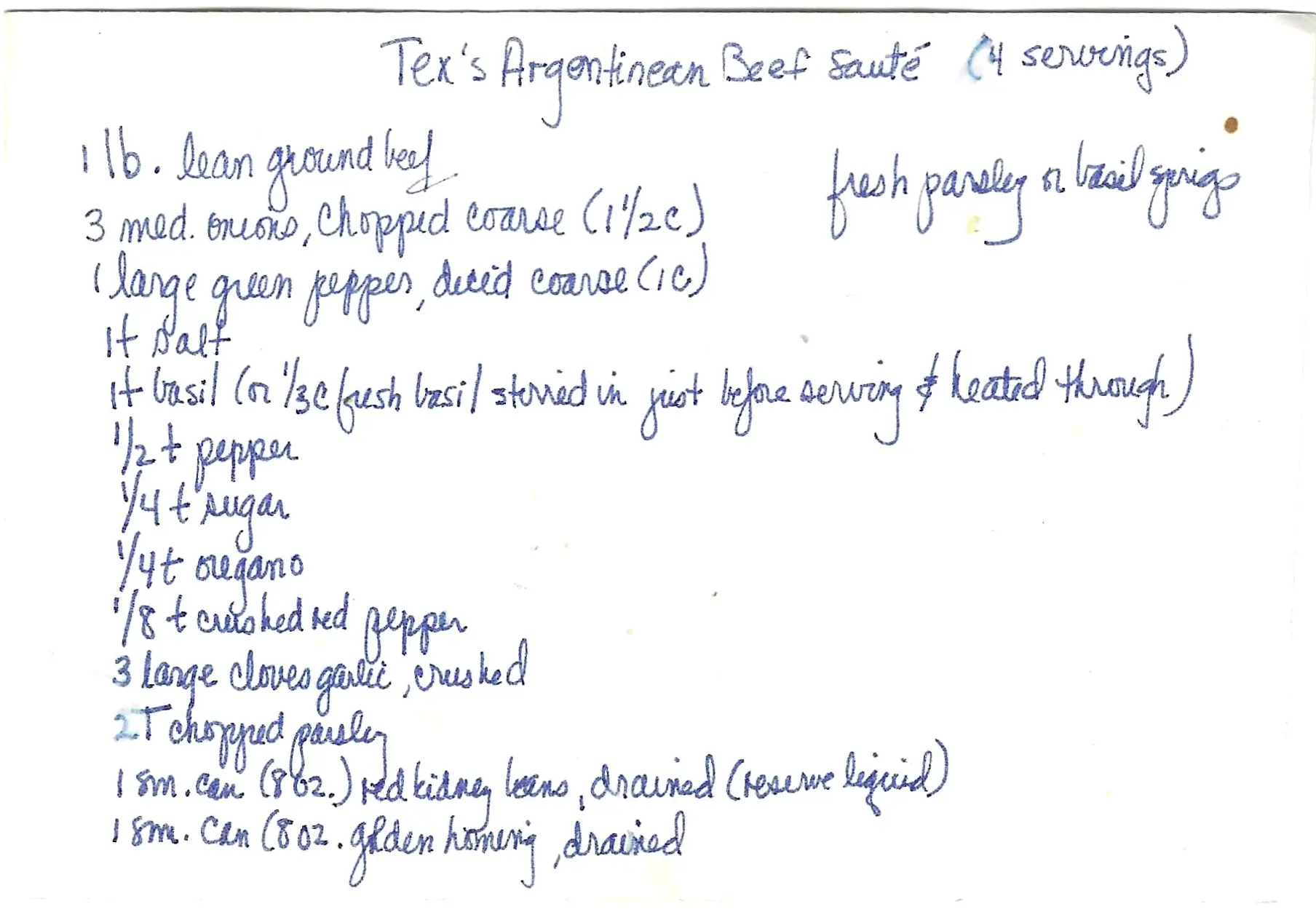 A flavorful one-skillet meal from ‘Tex’. Features ground beef, kidney beans, and hominy sautéed with onions, peppers, and savory herbs like basil and oregano.